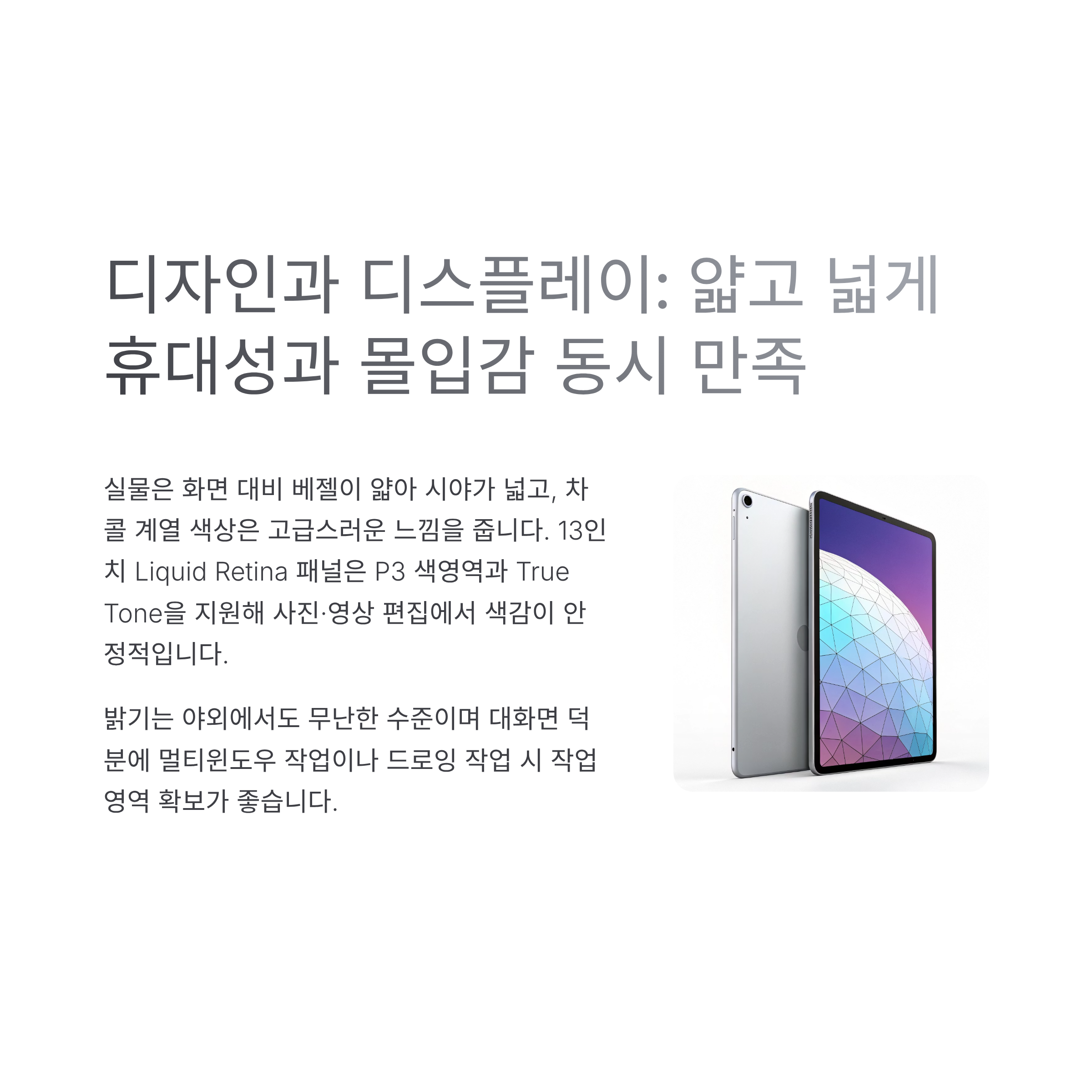 디자인과 디스플레이: 얇고 넓게, 휴대성과 몰입감 동시 만족