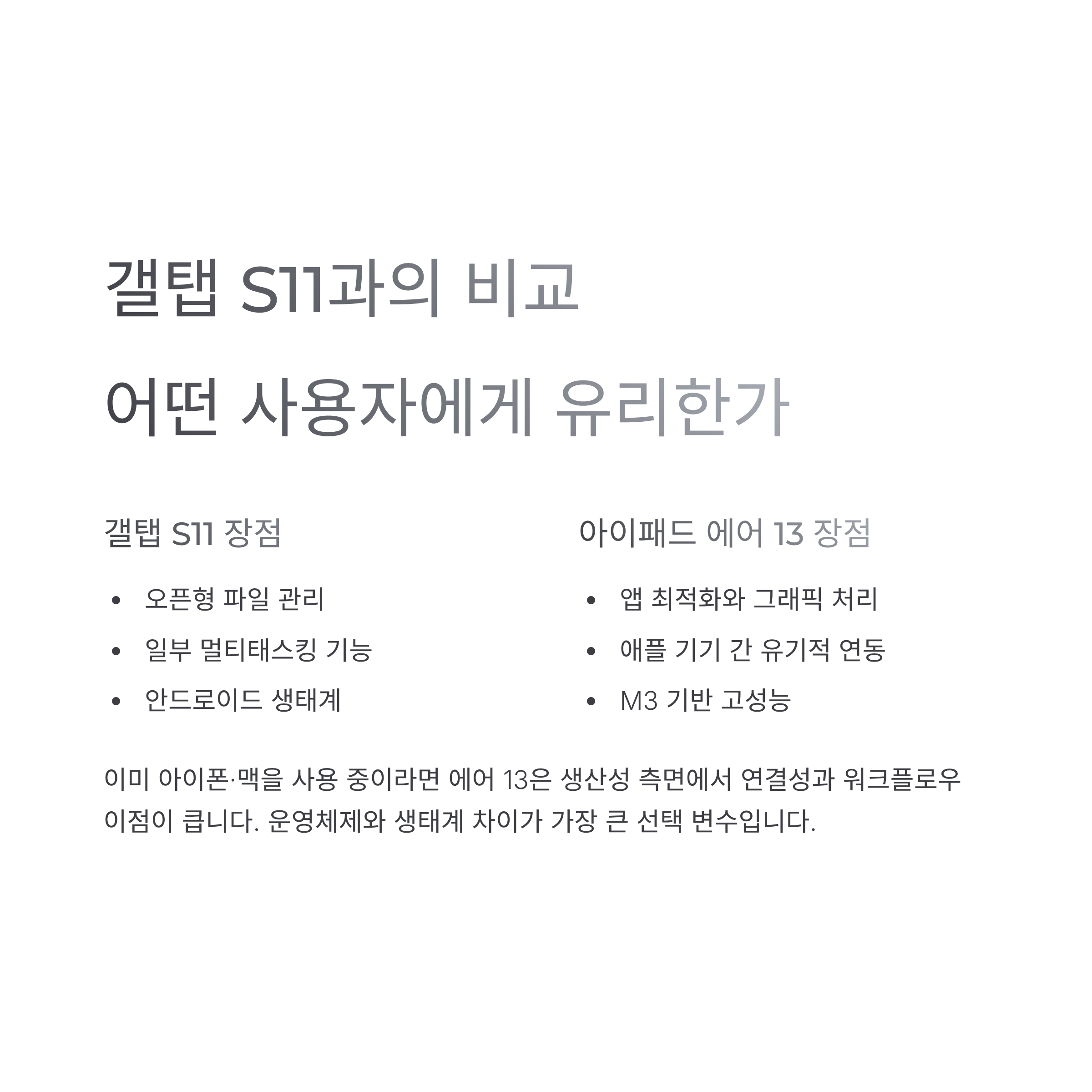 운영체제와 생태계 차이가 가장 큰 변수입니다. 안드로이드 기반 갤탭은 오픈형 파일 관리와 일부 멀티태스킹 기능에서 유리할 수 있지만, M3 기반 아이패드 에어 13은 앱 최적화와 그래픽 처리, 애플 기기 간 유기적 연동에서 이점을 제공합니다. 이미 아이폰·맥을 쓰고 있다면 에어 13은 생산성 측면에서 연결성과 워크플로우 이점이 큽니다.