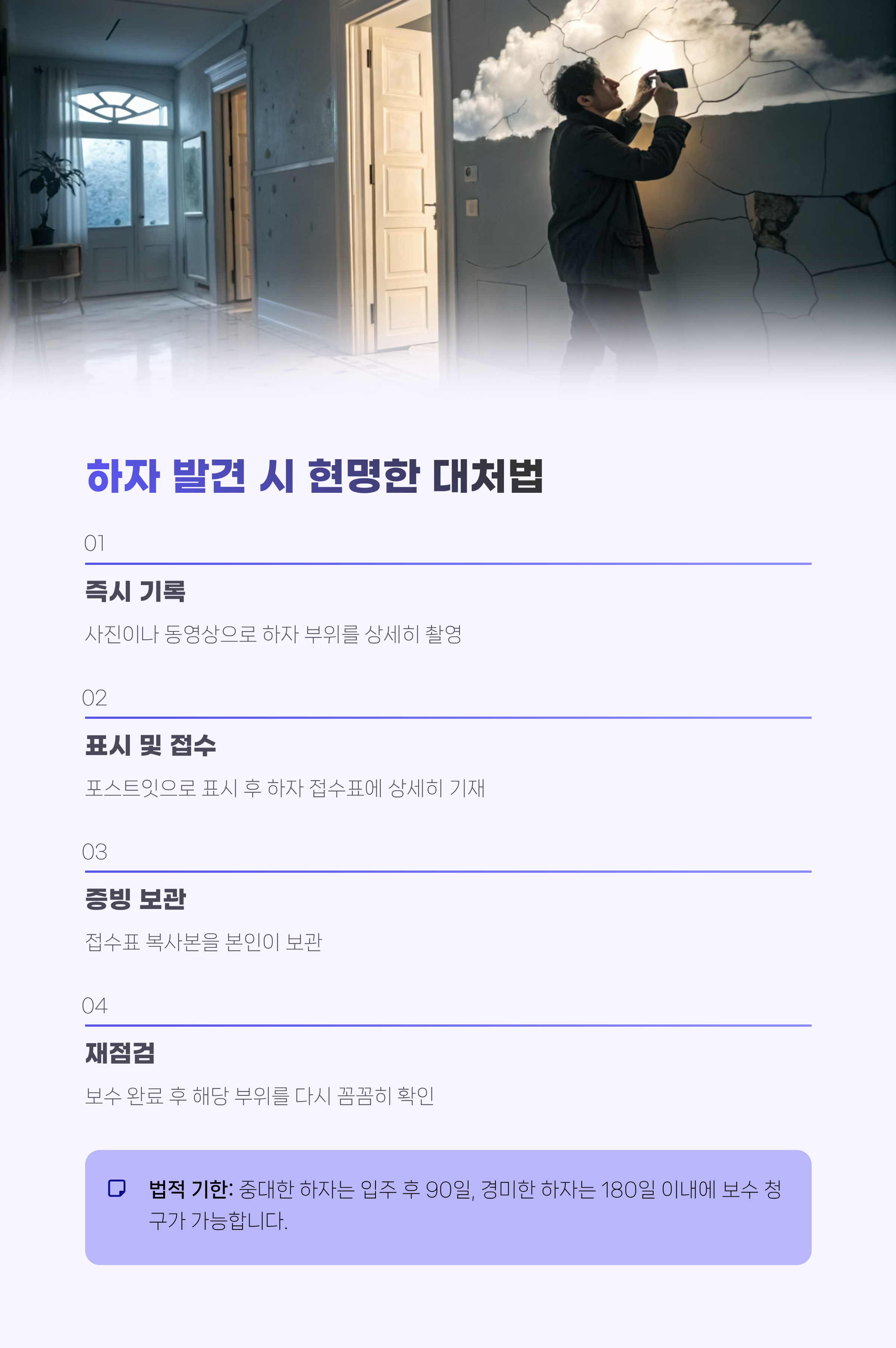 법적으로 중대한 하자는 입주 후 90일, 경미한 하자는 180일 이내에 보수 청구가 가능하다는 점도 꼭 기억하세요.