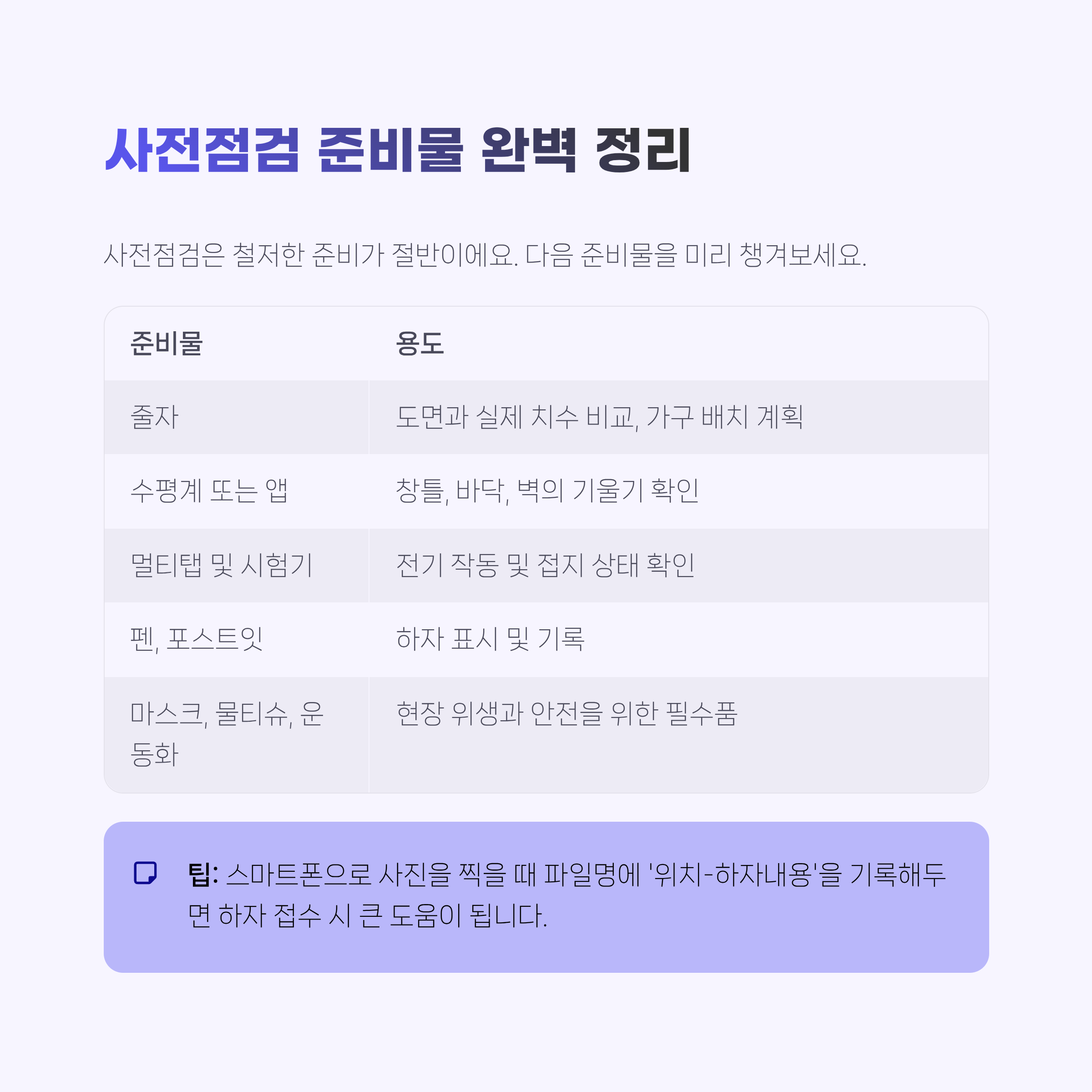 사전점검은 철저한 준비가 절반이에요. 다음 표를 참고해 준비물을 미리 챙겨보세요.