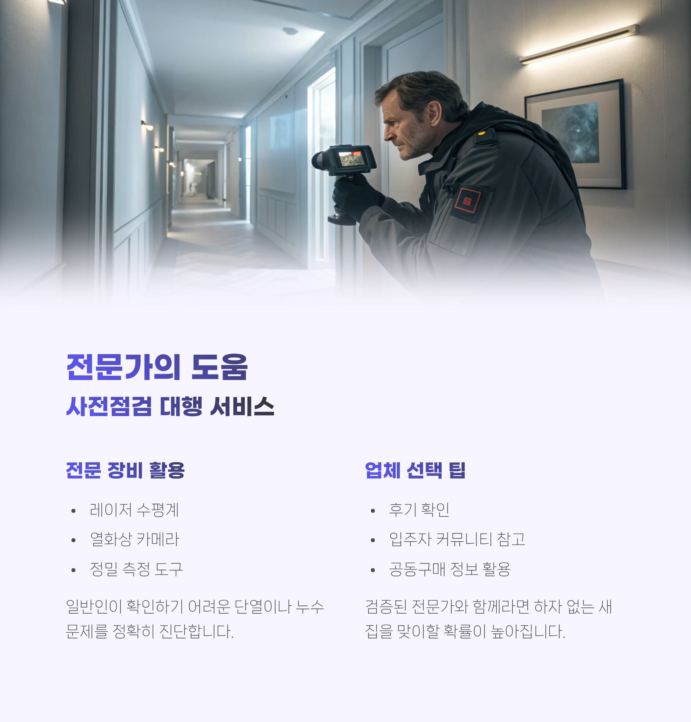전문 장비와 노하우를 갖춘 사전점검 대행 서비스도 요즘 인기가 많습니다. 레이저 수평계, 열화상 카메라 등으로 일반인이 확인하기 어려운 단열이나 누수 문제를 정확히 진단해 줍니다.