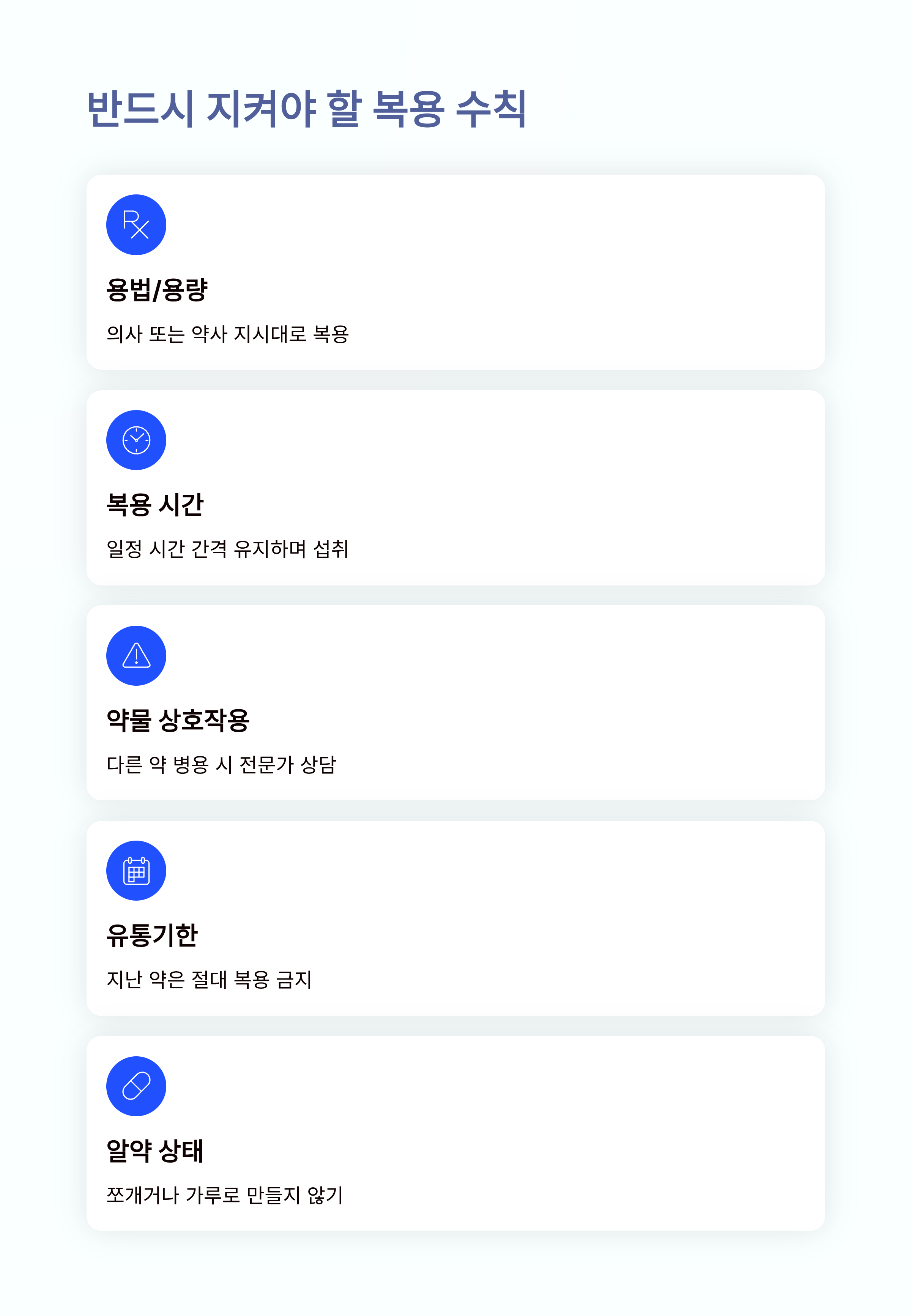 약을 제대로 복용하려면 다음 사항을 꼭 지켜야 합니다.