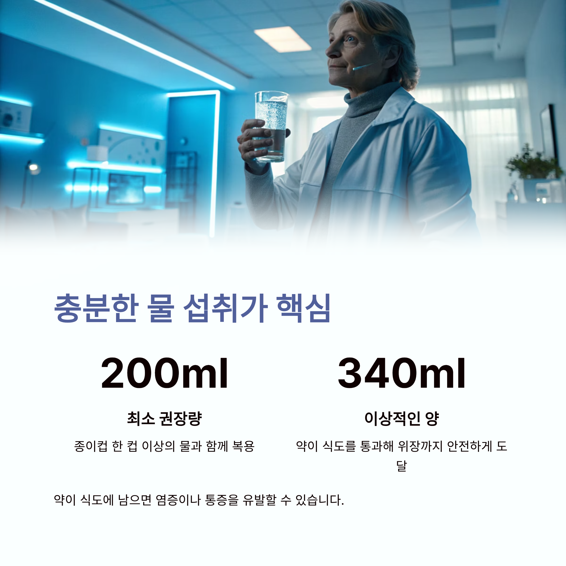 약을 삼킬 때는 꼭 종이컵 한 컵(200~340ml) 이상의 물을 함께 드세요. 약이 식도에 걸리지 않고 위장까지 제대로 도달해야 부작용을 줄이고 흡수율도 높일 수 있어요. 알약이 식도에 남아 있으면 염증이나 통증을 유발할 수 있다는 점, 잊지 마세요.