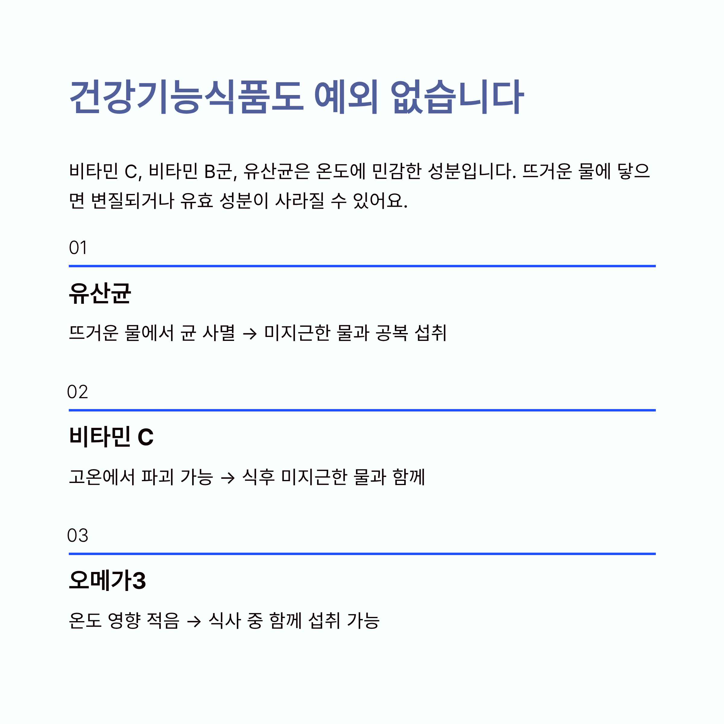 비타민 C, 비타민 B군, 유산균처럼 온도에 민감한 성분들은 뜨거운 물에 닿으면 변질되거나 유효 성분이 사라질 수 있어요. 이런 건강기능식품은 꼭 미지근한 물과 함께 섭취하세요.