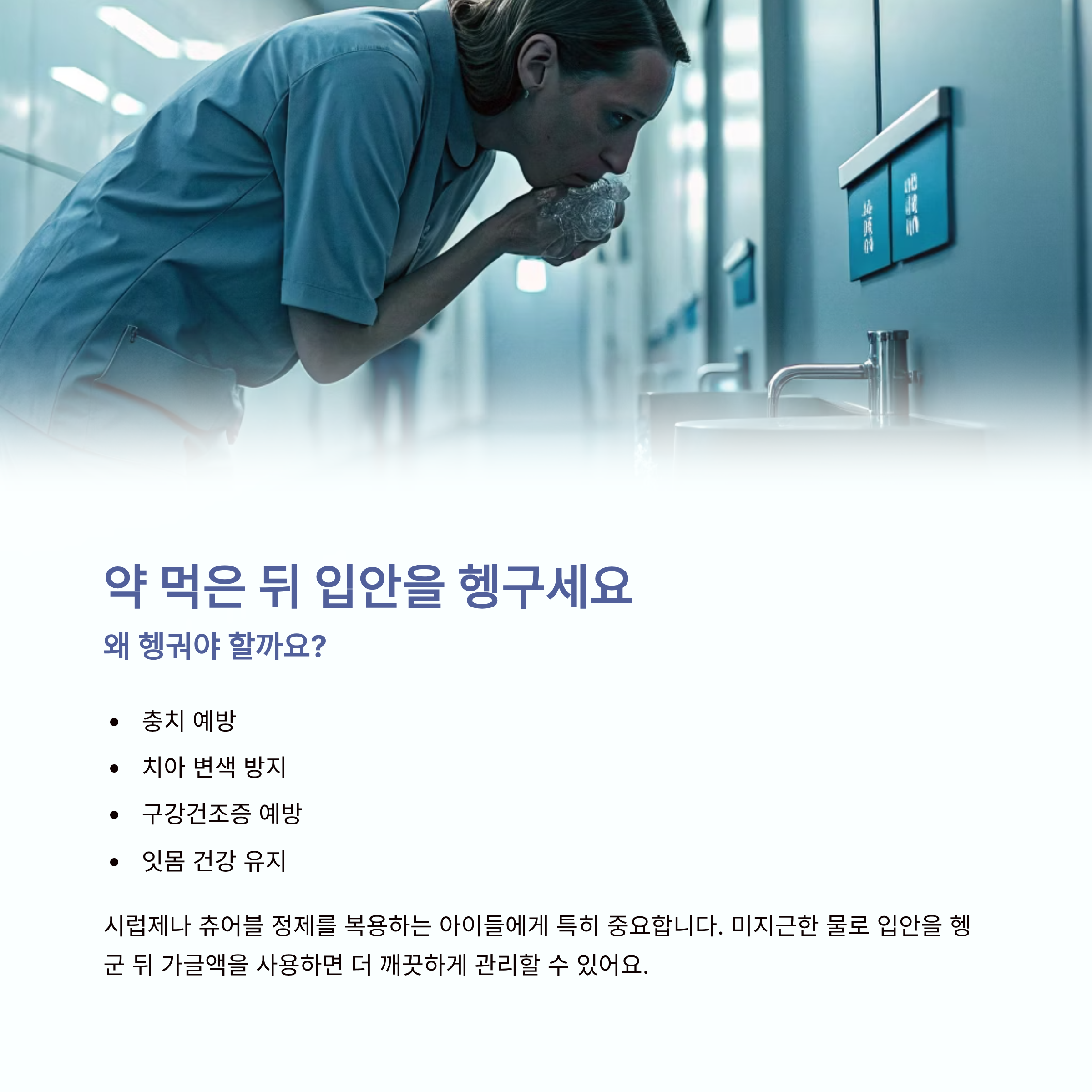 약 복용 후 입 안을 헹구지 않으면 약 성분이 치아나 잇몸에 남아 충치, 변색, 구강건조증을 유발할 수 있어요. 시럽제나 츄어블 정제를 자주 복용하는 아이들에게는 특히 더 신경 써야 해요.