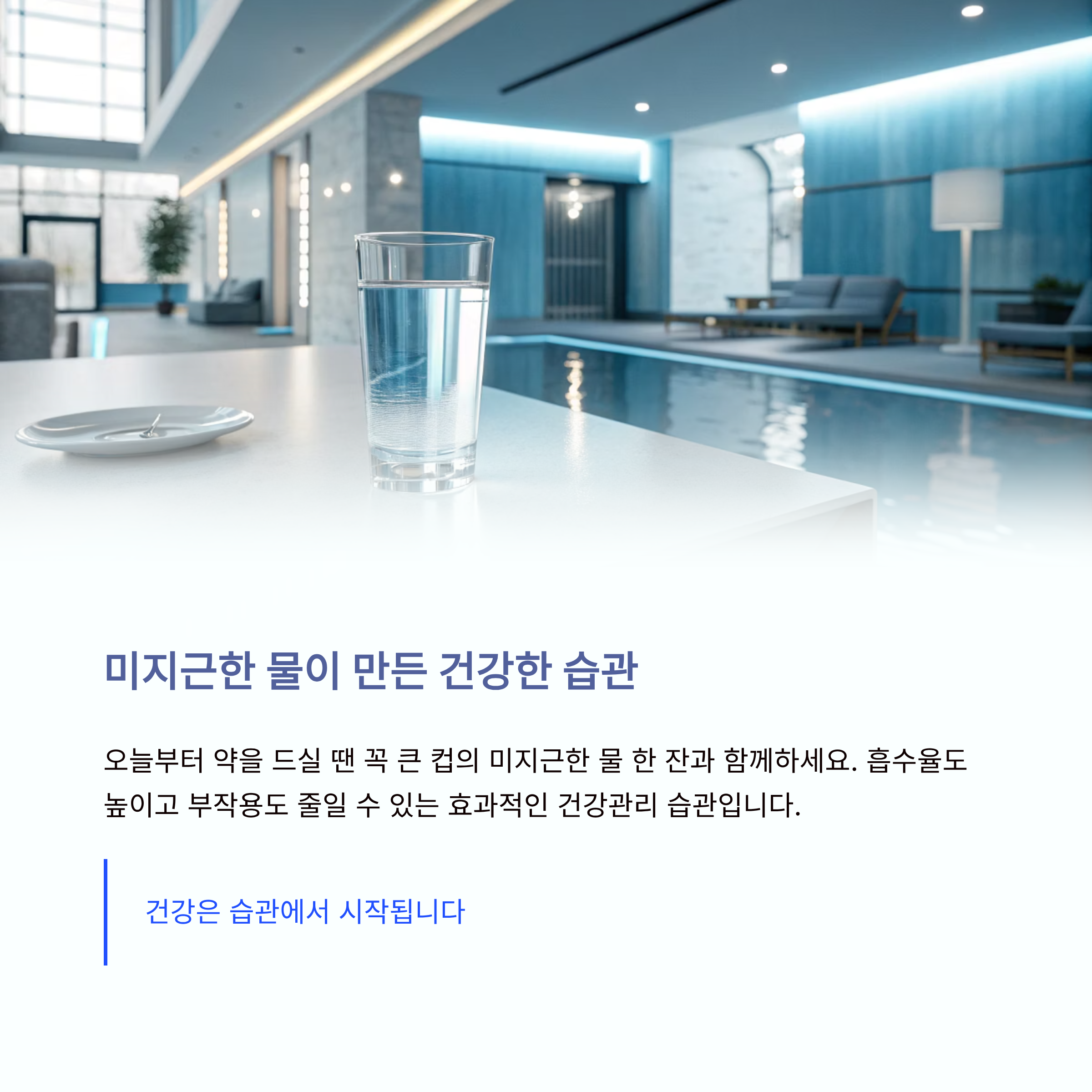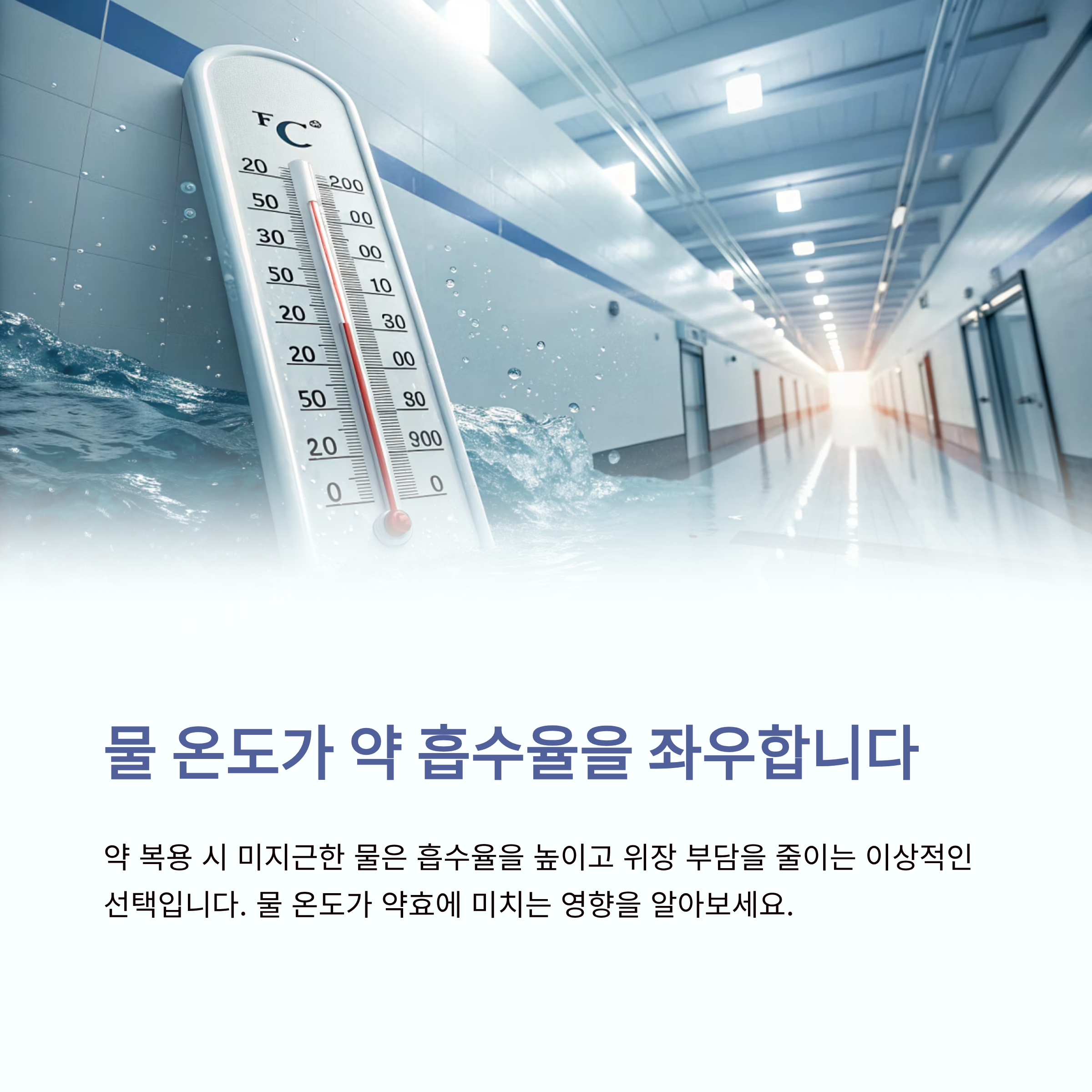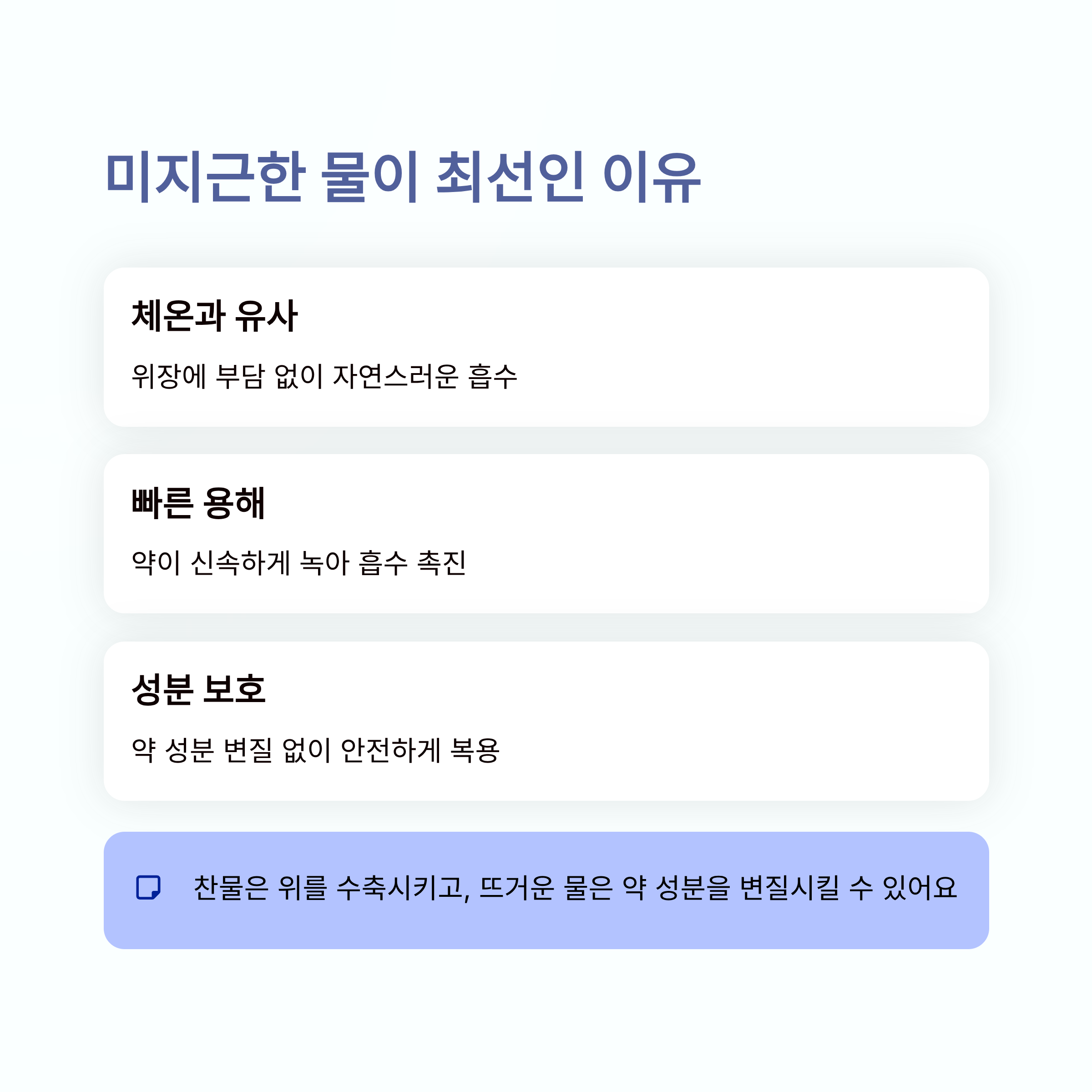 미지근한 물은 우리 몸의 체온과 유사해 위장에 부담을 주지 않고, 약이 빠르게 녹아 위장관을 통해 자연스럽게 흡수될 수 있도록 도와줘요. 반대로 찬물은 위를 수축시키고, 뜨거운 물은 약 성분을 변질시킬 수 있다는 점도 기억해 주세요.