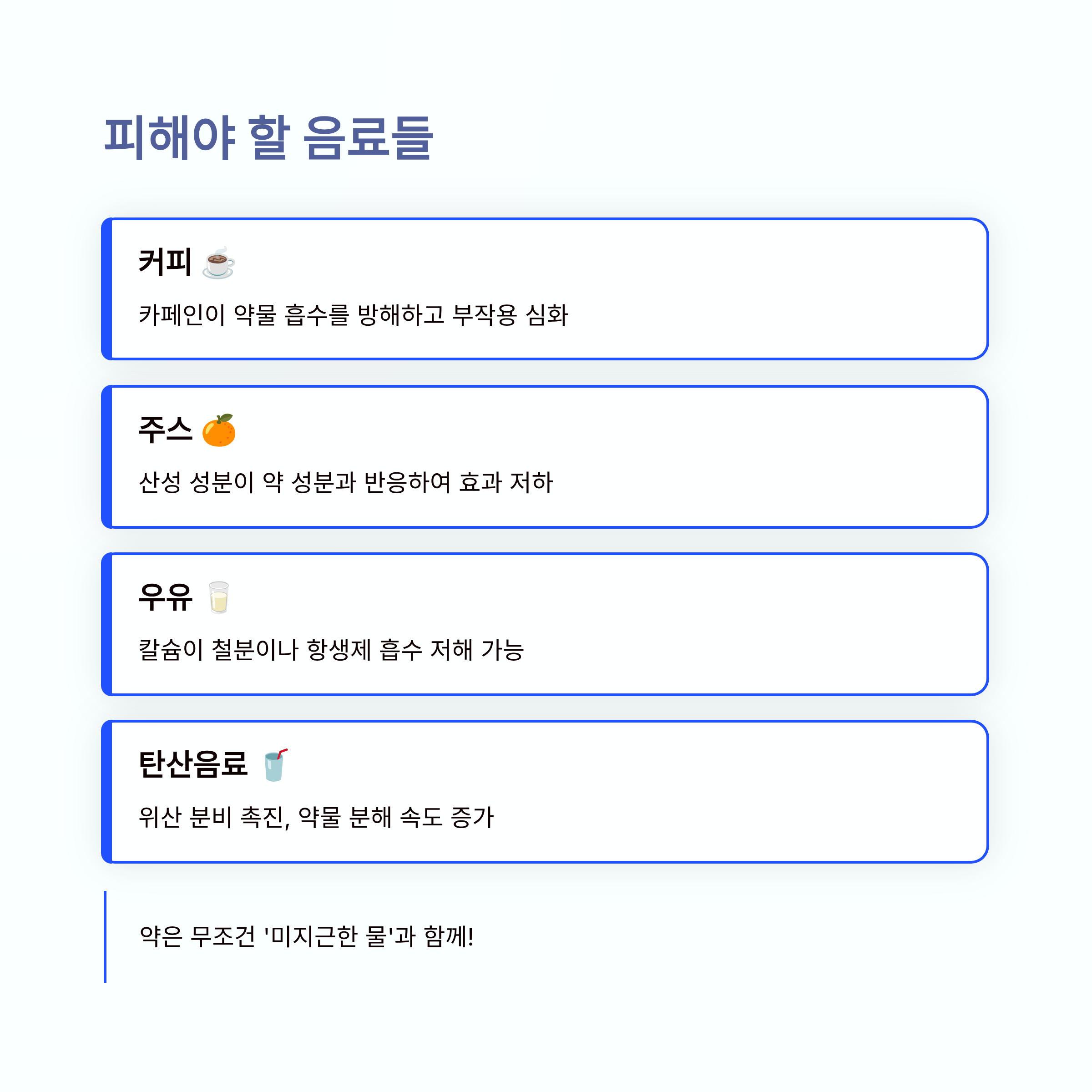 | 커피 | 카페인이 약물 흡수를 방해하고 부작용을 심화 |