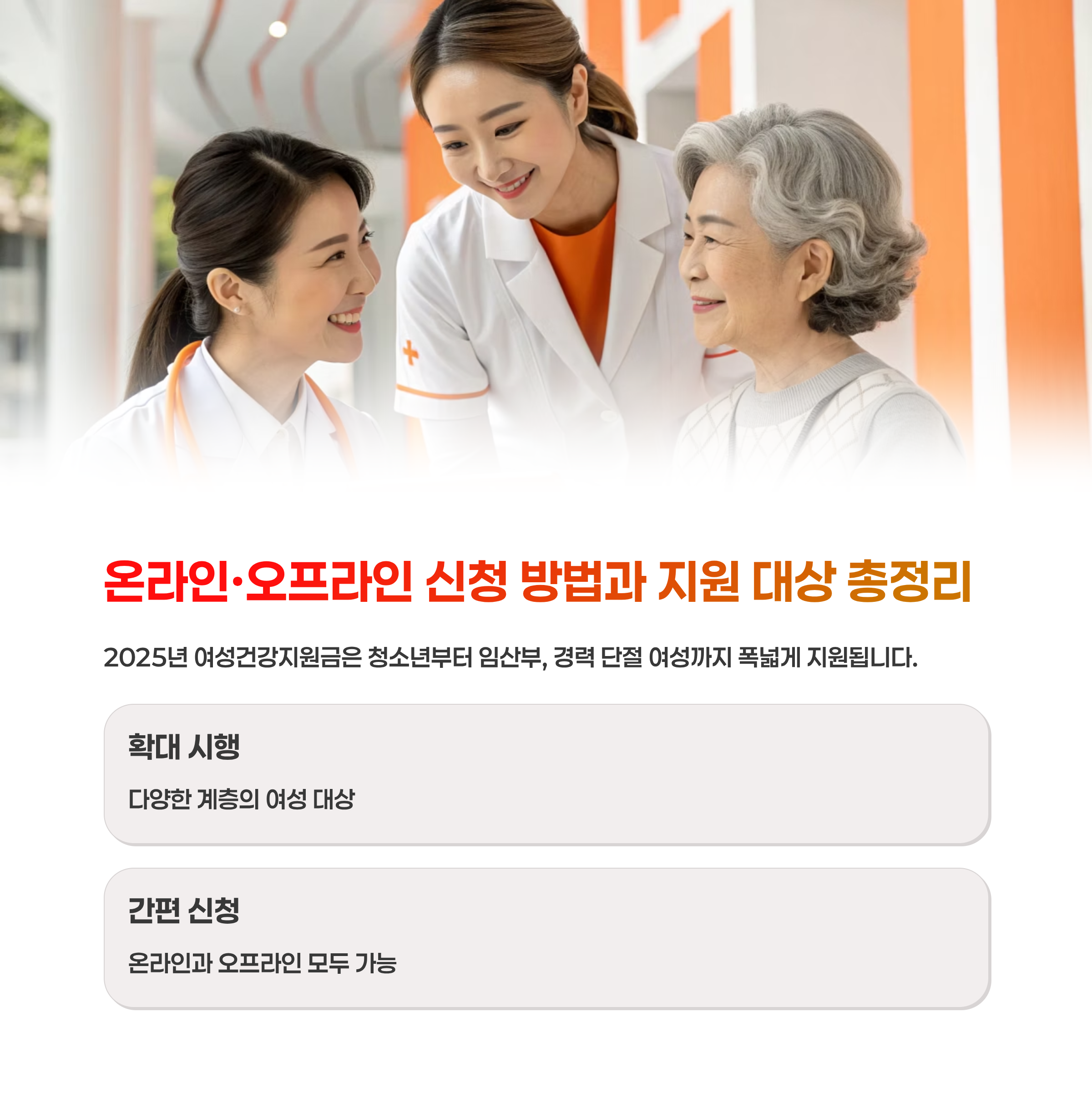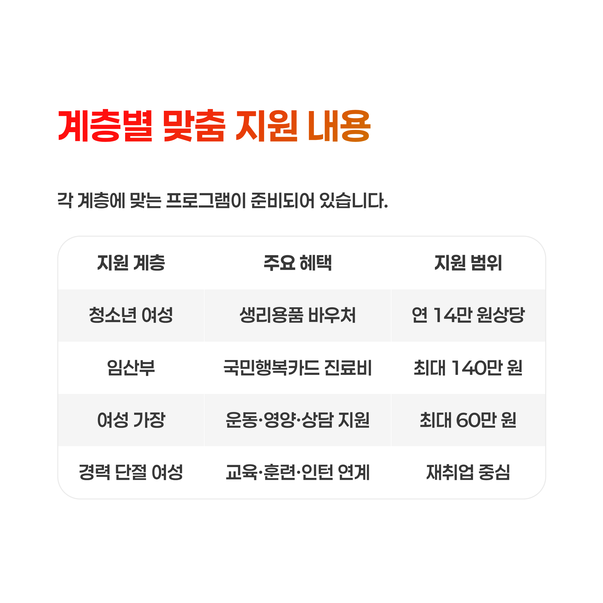 청소년 여성은 생리용품 바우처, 임산부는 진료비 지원, 여성 가장은 건강관리 프로그램, 경력 단절 여성은 재취업 지원 등 각 계층에 맞는 프로그램이 준비되어 있습니다.