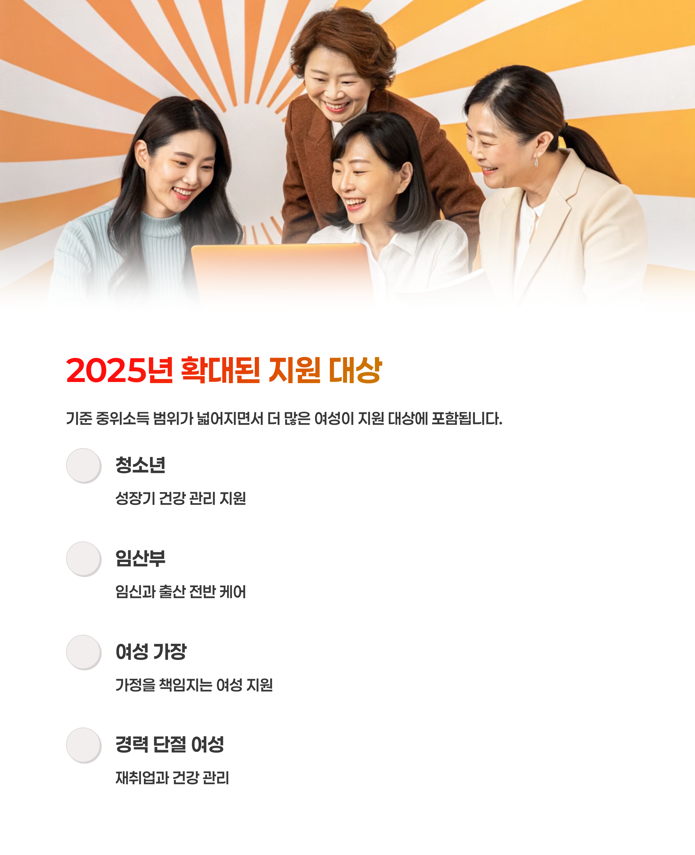 기준 중위소득 범위가 넓어지면서 더 많은 여성이 지원 대상에 포함됩니다. 청소년, 임산부, 여성 가장, 활동가, 경력 단절 여성 등 상황에 맞는 혜택을 받을 수 있습니다.