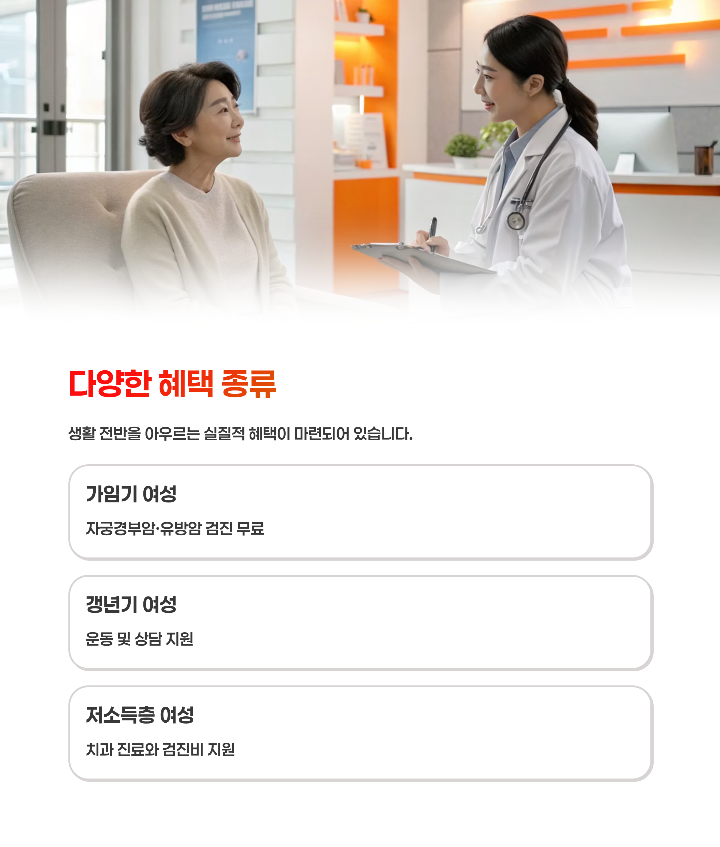 가임기 여성은 자궁경부암·유방암 검진 무료 혜택, 갱년기 여성은 운동 및 상담 지원, 저소득층 여성은 치과 진료와 검진비까지 지원받을 수 있습니다. 생활 전반을 아우르는 실질적 혜택이 마련된 것이 특징입니다.