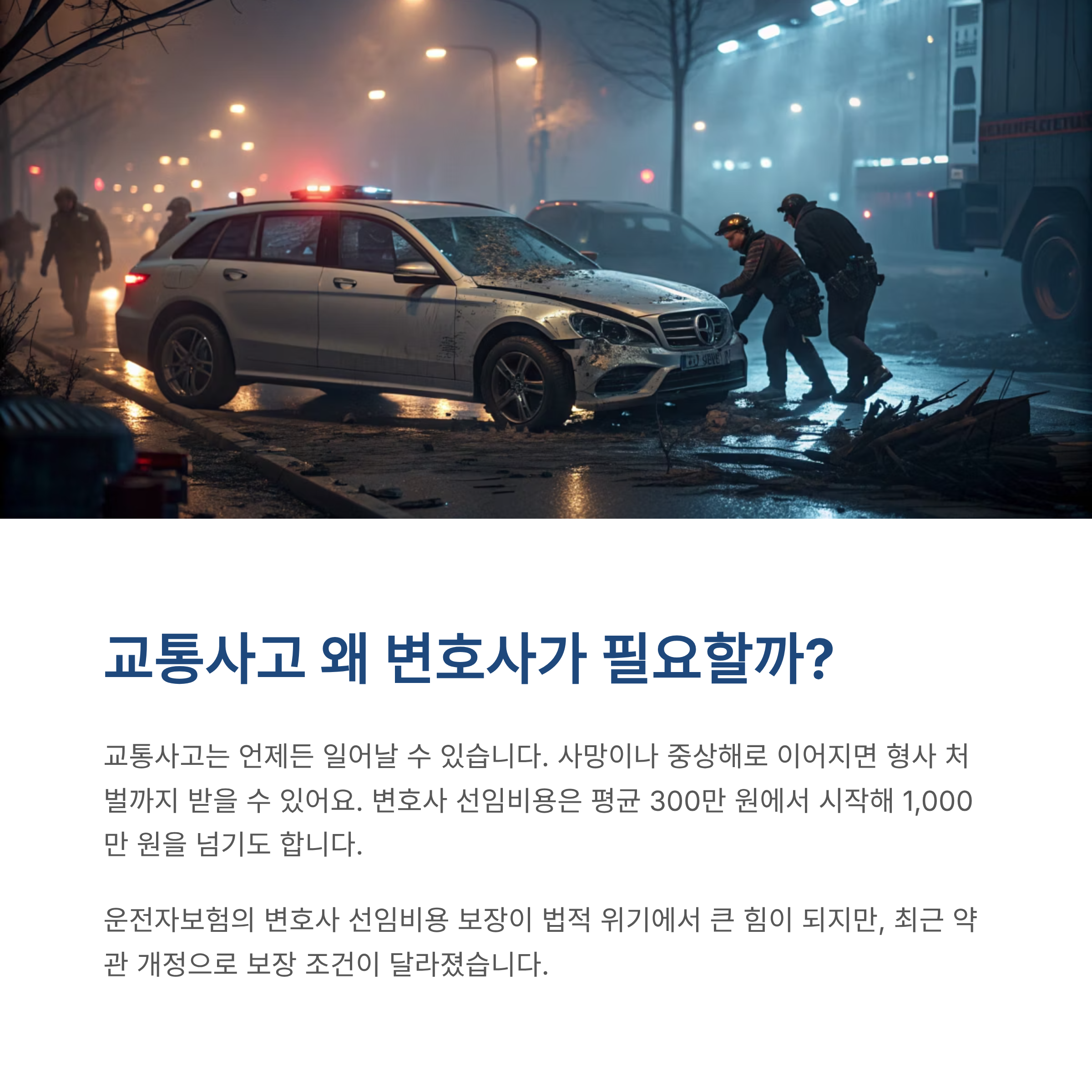 교통사고는 언제 누구에게나 일어날 수 있습니다. 특히 사망이나 중상해 등으로 이어질 경우 형사 처벌까지도 받을 수 있는데요, 이때 가장 크게 다가오는 건 바로 변호사 선임비용입니다. 운전자보험의 핵심 보장 중 하나인 변호사 선임비용 보장은 법적 위기 상황에서 큰 힘이 될 수 있지만, 최근 약관 개정으로 인해 보장 조건이 달라졌습니다. 오늘은 그 변화와 실제 사례, 가입 전 체크 포인트까지 꼼꼼히 정리해 드릴게요.