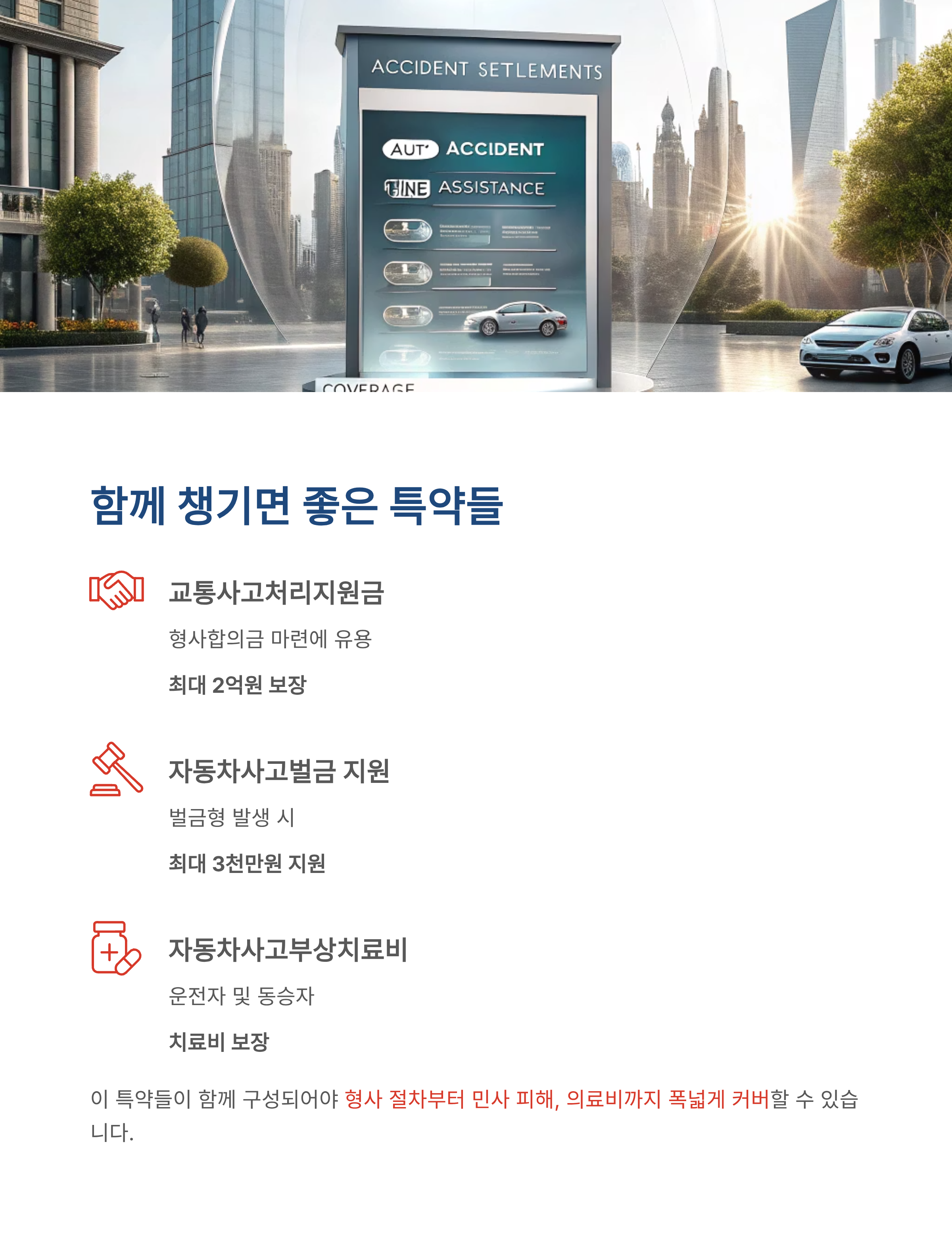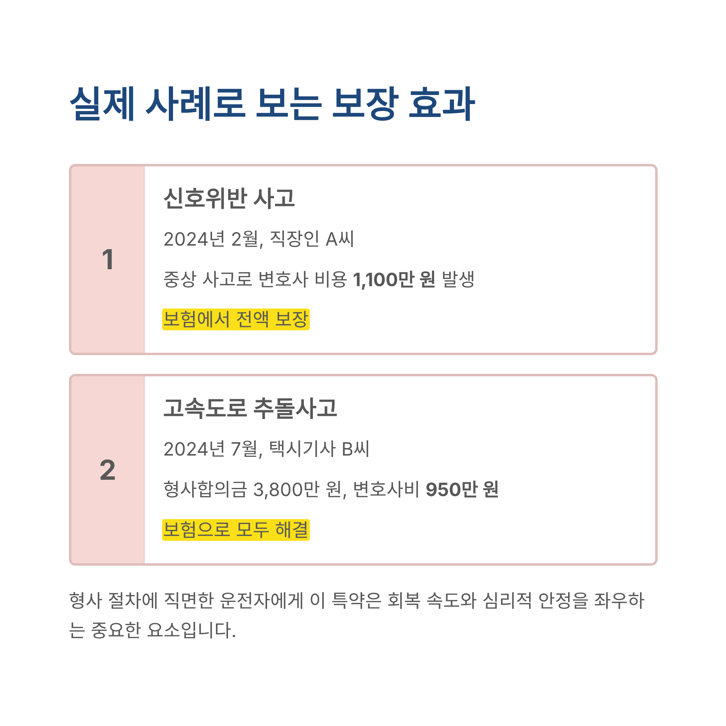 실제로 형사 절차에 직면한 운전자에게 이 특약은 회복 속도와 심리적 안정을 좌우하는 중요한 요소가 되고 있습니다.