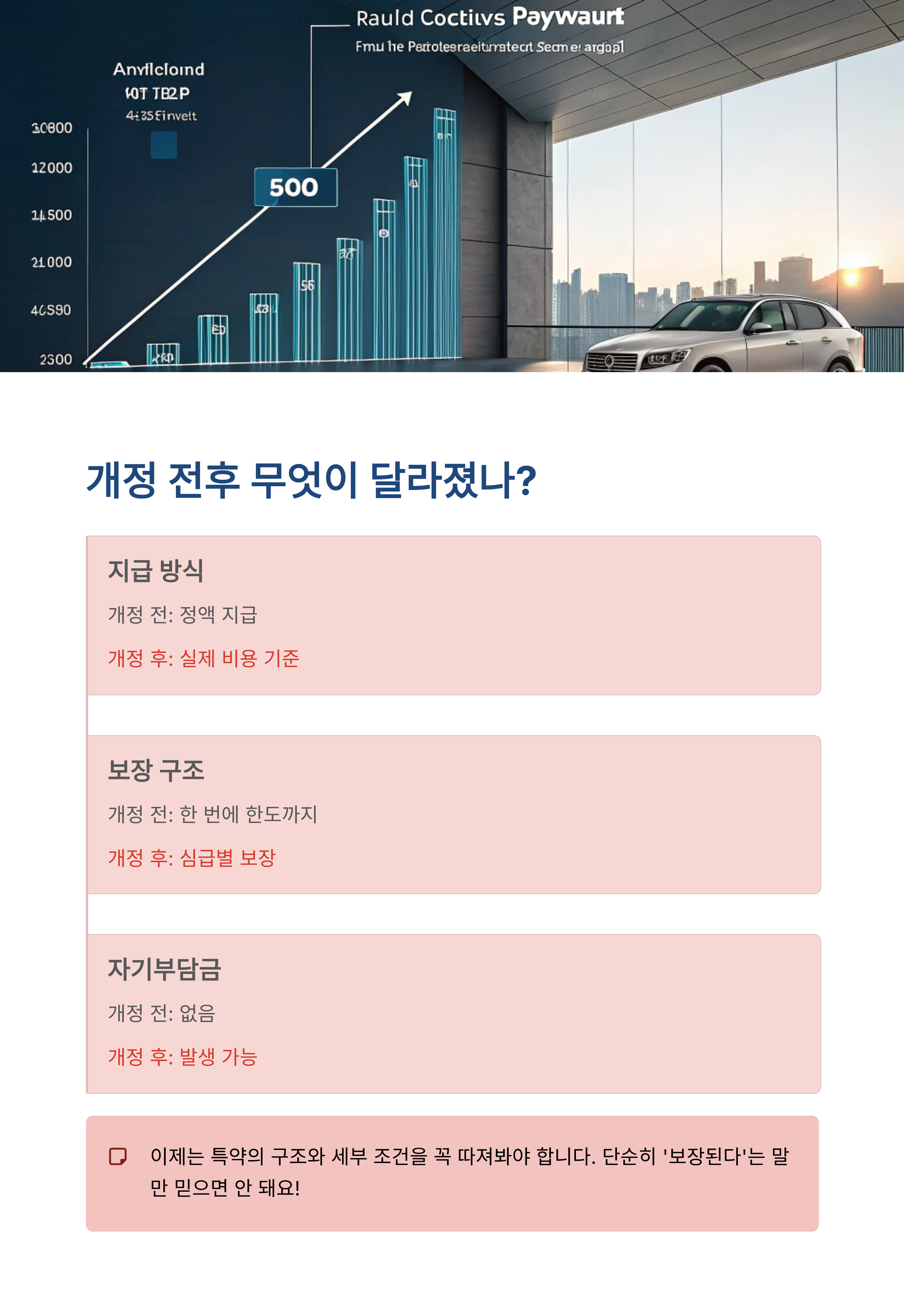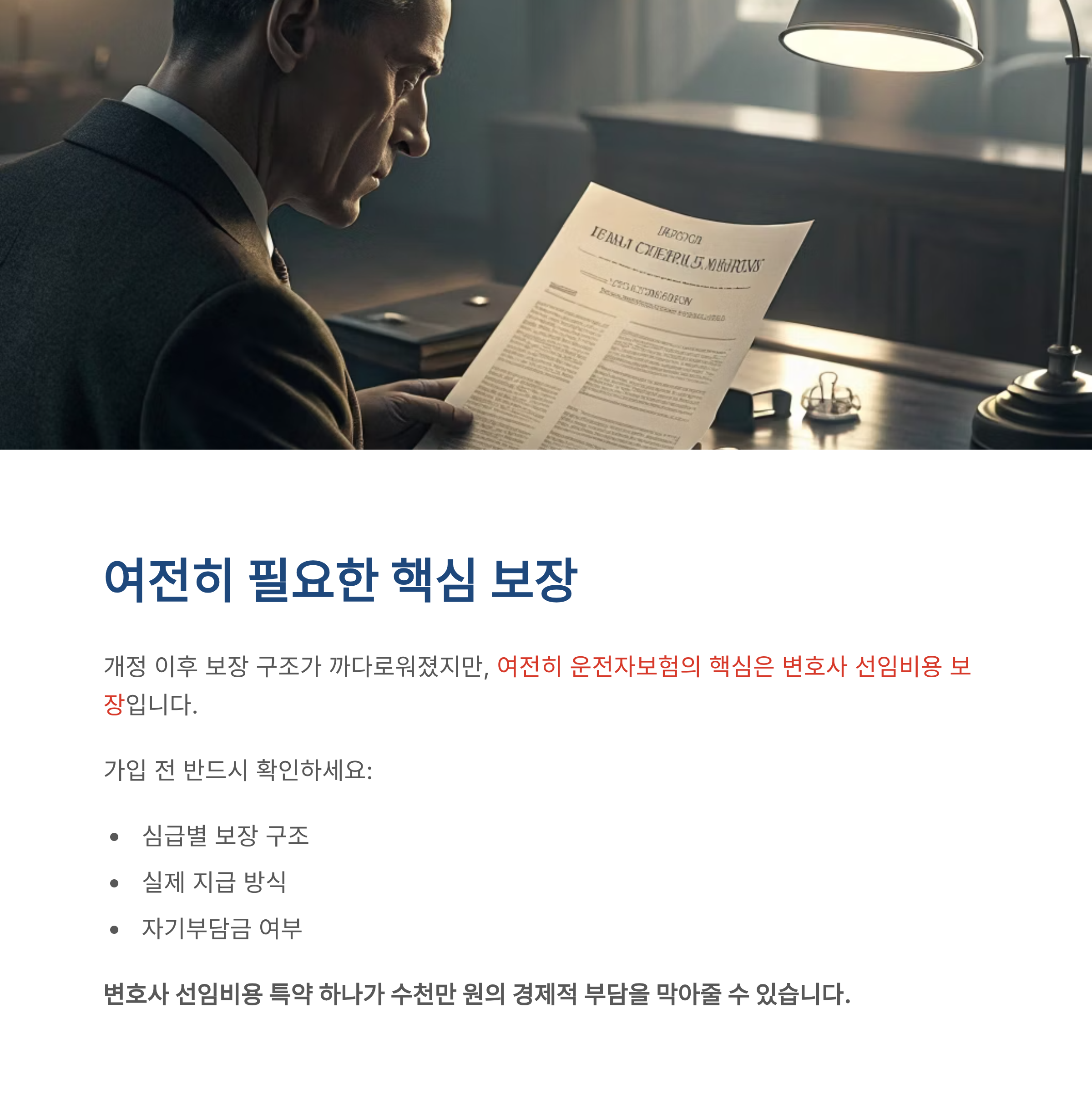 물론입니다. 개정 이후 보장 구조가 조금 까다로워졌지만, 여전히 운전자보험의 핵심은 변호사 선임비용 보장이에요. 특히 보장 내용이 다양하게 바뀌고 있기 때문에, 보험에 가입하기 전엔 반드시 심급별 구조와 지급 방식, 자기부담금 여부까지 꼼꼼하게 확인하는 것이 필요합니다.