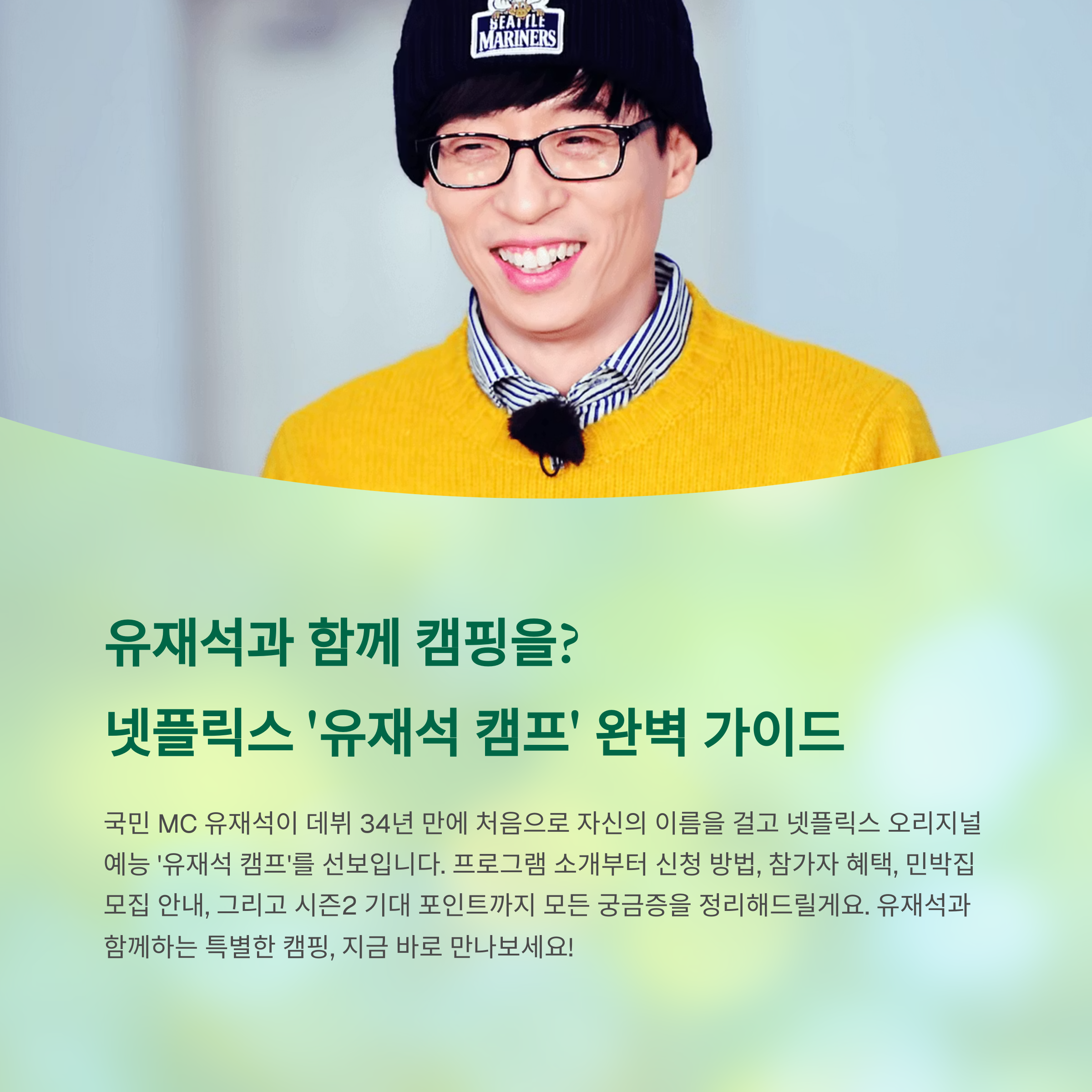 국민 MC 유재석이 데뷔 34년 만에 처음으로 자신의 이름을 걸고 넷플릭스 오리지널 예능 ‘유재석 캠프’를 선보입니다. 본 글에서는 프로그램 소개부터 신청 방법, 참가자 혜택, 민박집 모집 안내, 그리고 시즌2 기대 포인트까지 모든 궁금증을 정리해드릴게요. 유재석과 함께하는 특별한 캠핑, 지금 바로 만나보세요!