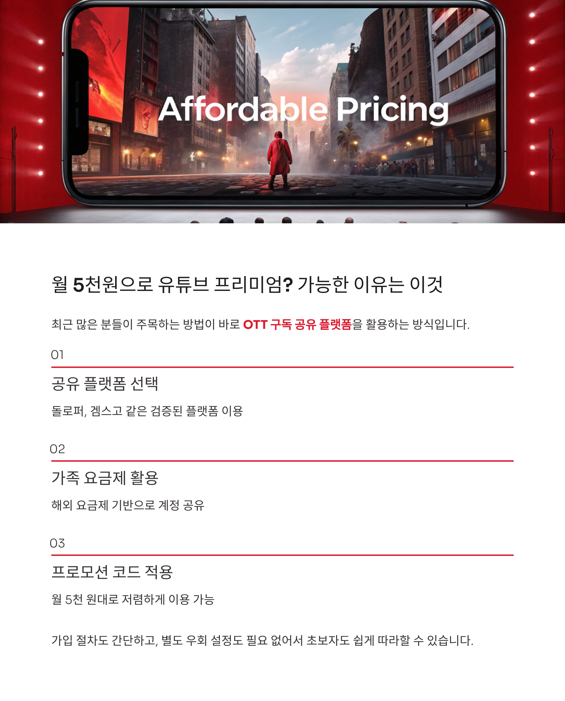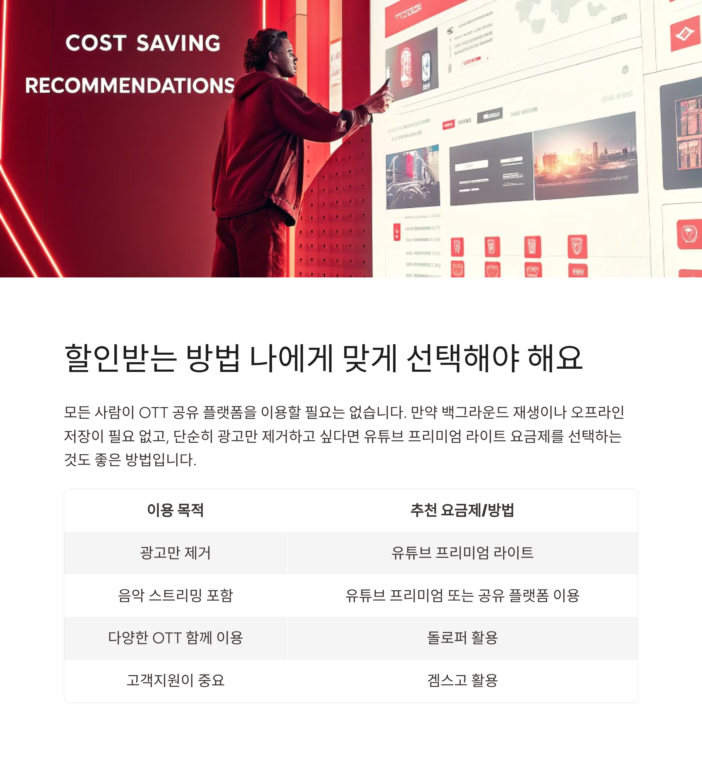 모든 사람이 OTT 공유 플랫폼을 이용할 필요는 없어요. 만약 백그라운드 재생이나 오프라인 저장이 필요 없고, 단순히 광고만 제거하고 싶다면 유튜브 프리미엄 라이트 요금제를 선택하는 것도 좋은 방법이에요.