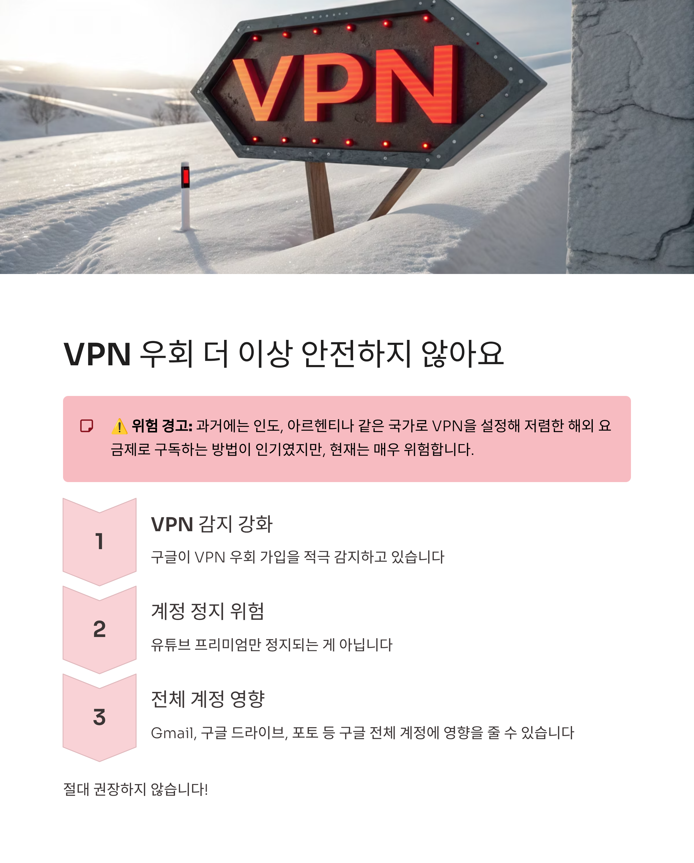 구글에서 VPN을 통한 우회 가입을 감지하고 계정을 정지시키는 경우가 점점 늘고 있어요. 유튜브 프리미엄만 정지되는 게 아니라 Gmail, 구글 드라이브, 포토 등 구글 전체 계정에 영향을 줄 수 있으니 절대 권장하지 않습니다.