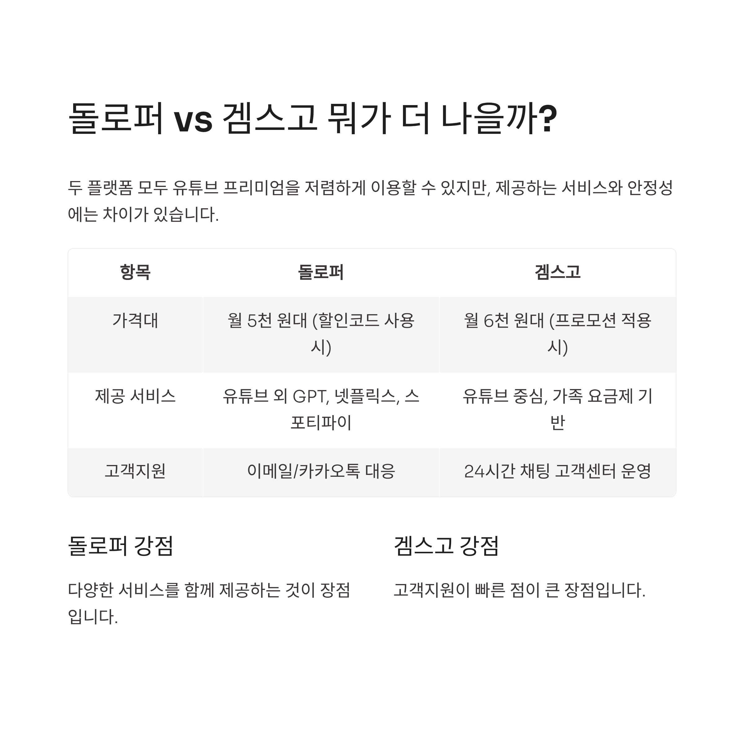 | 제공 서비스 | 유튜브 외 GPT, 넷플릭스, 스포티파이 | 유튜브 중심, 가족 요금제 기반 운영 |