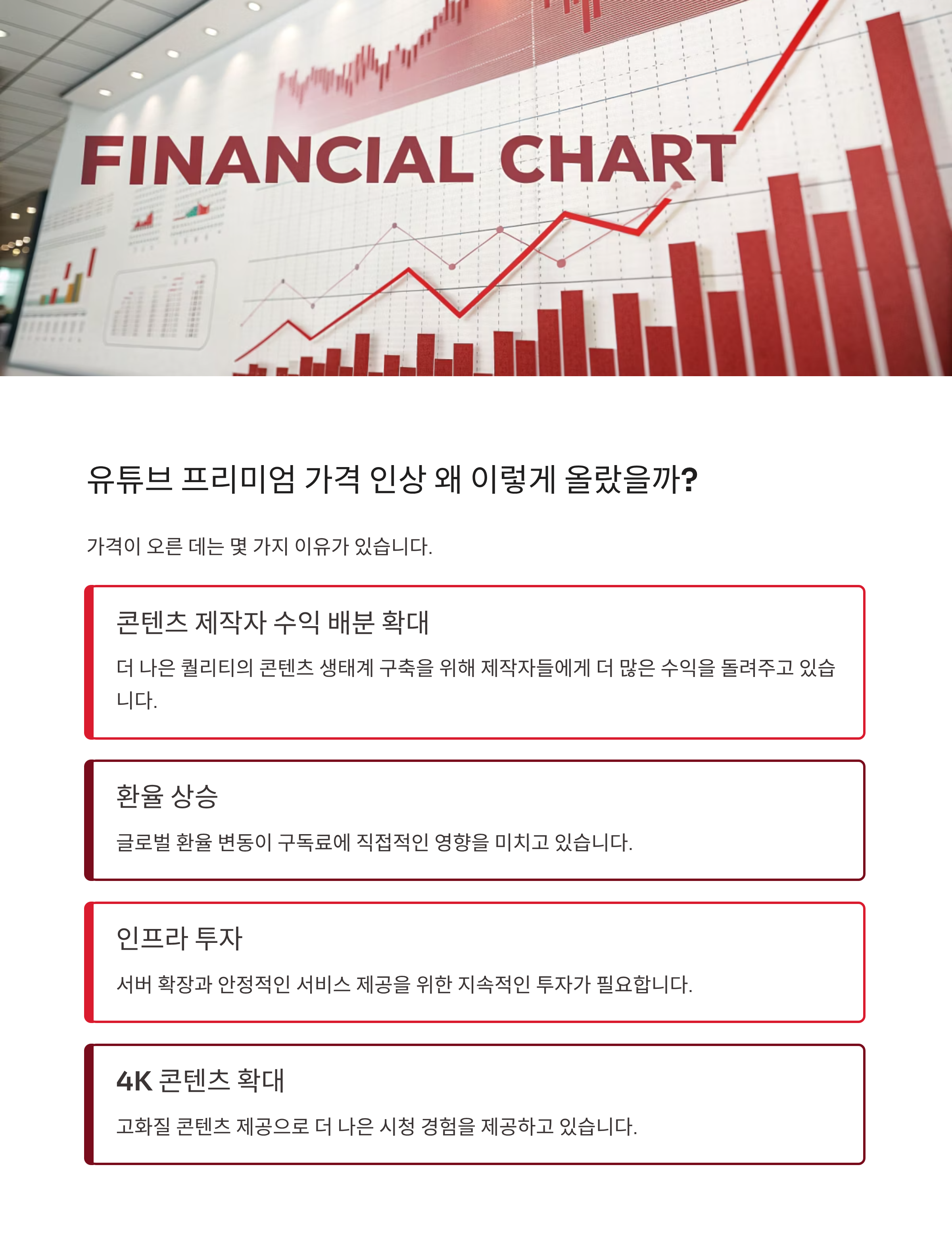 가격이 오른 데는 몇 가지 이유가 있어요. 가장 큰 요인은 콘텐츠 제작자들에게 돌아가는 수익 배분 확대. 유튜브는 더 나은 퀄리티의 콘텐츠 생태계를 구축하기 위해 제작자들에게 더 많은 수익을 돌려주고자 하고 있어요.