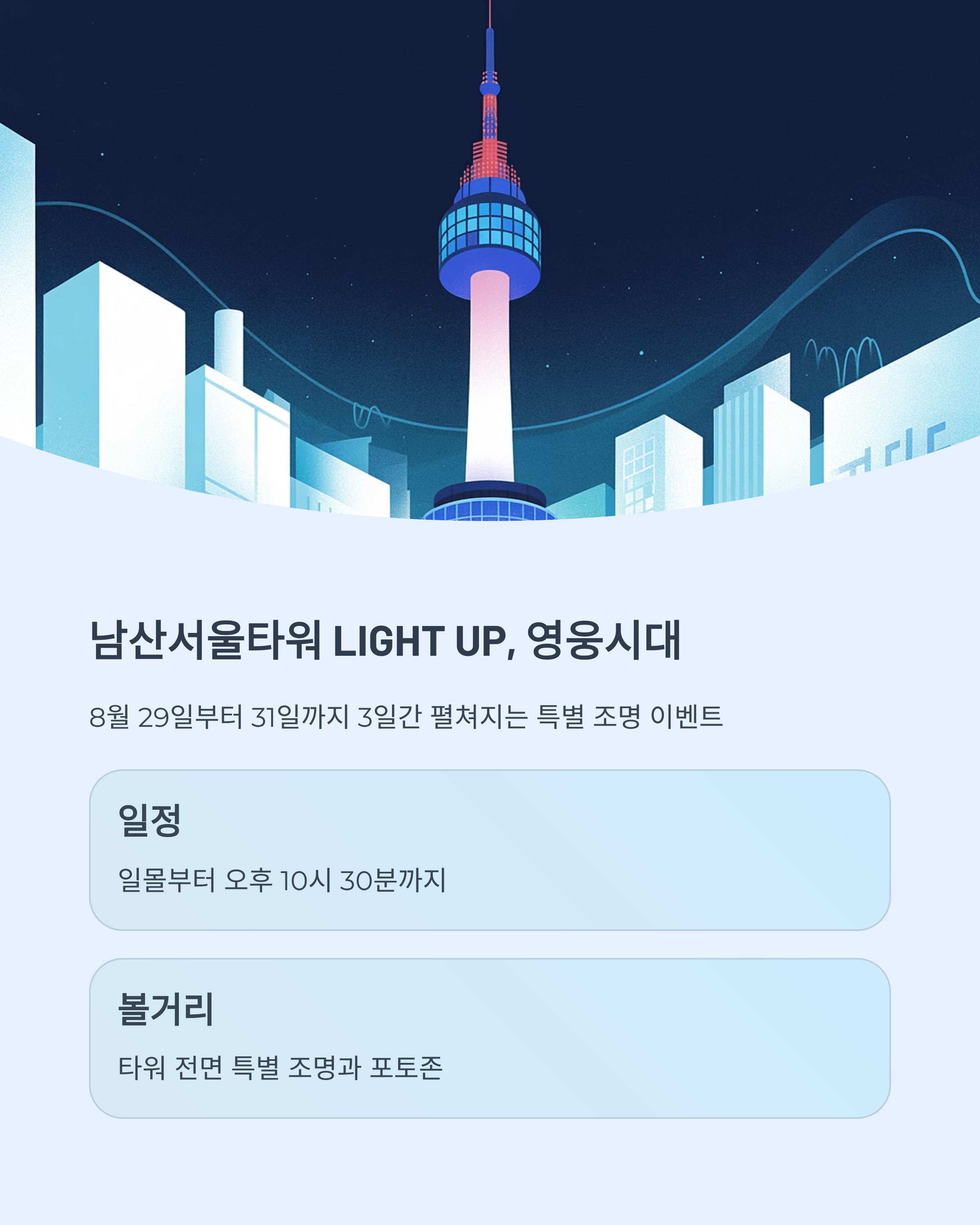 | LIGHT UP, 영웅시대 | 하늘빛 조명라이팅 | 8월 29~31일 | 남산서울타워 |