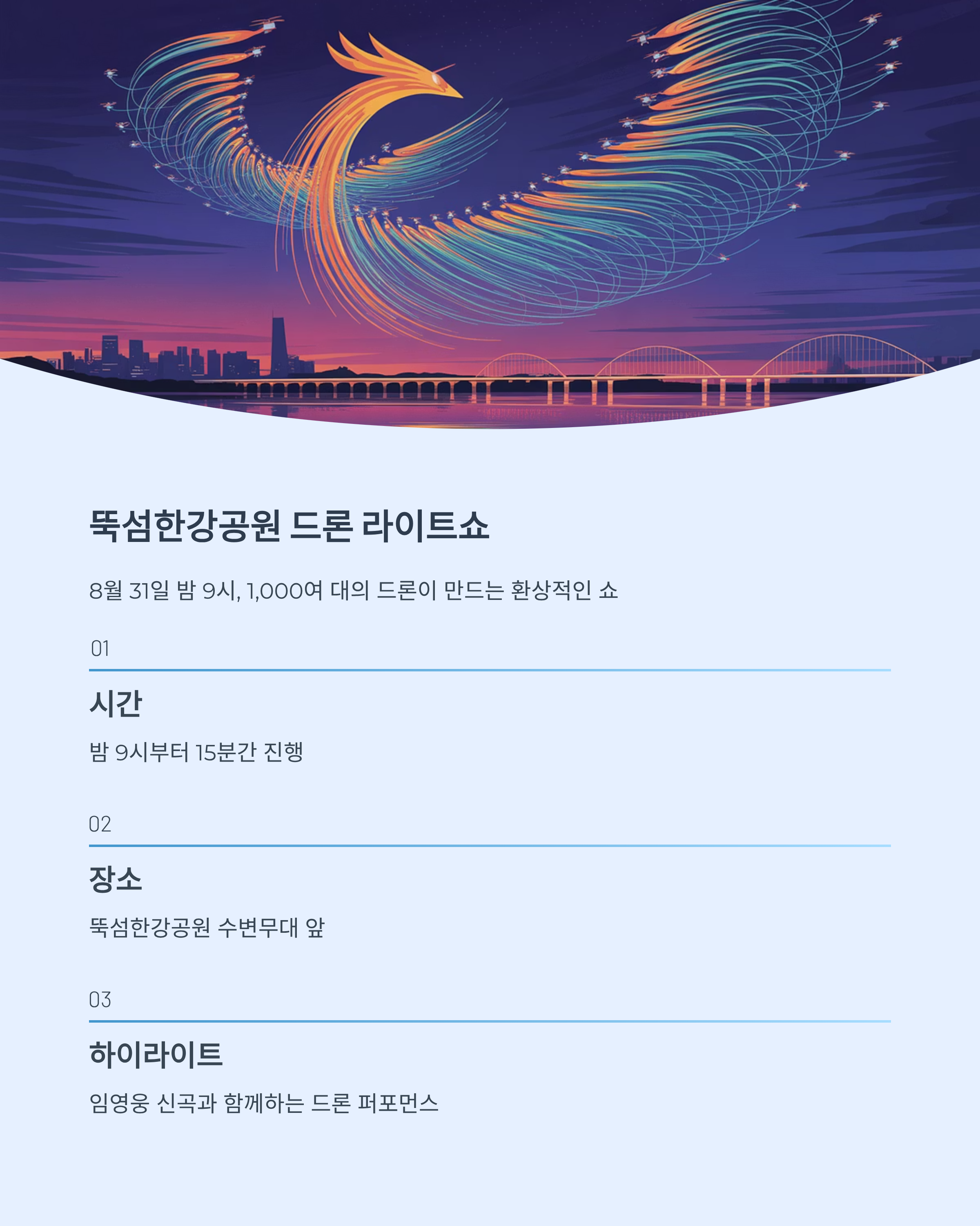 | FLY HIGH, IM HERO2 | 드론 라이트쇼 | 8월 31일 | 뚝섬한강공원 |