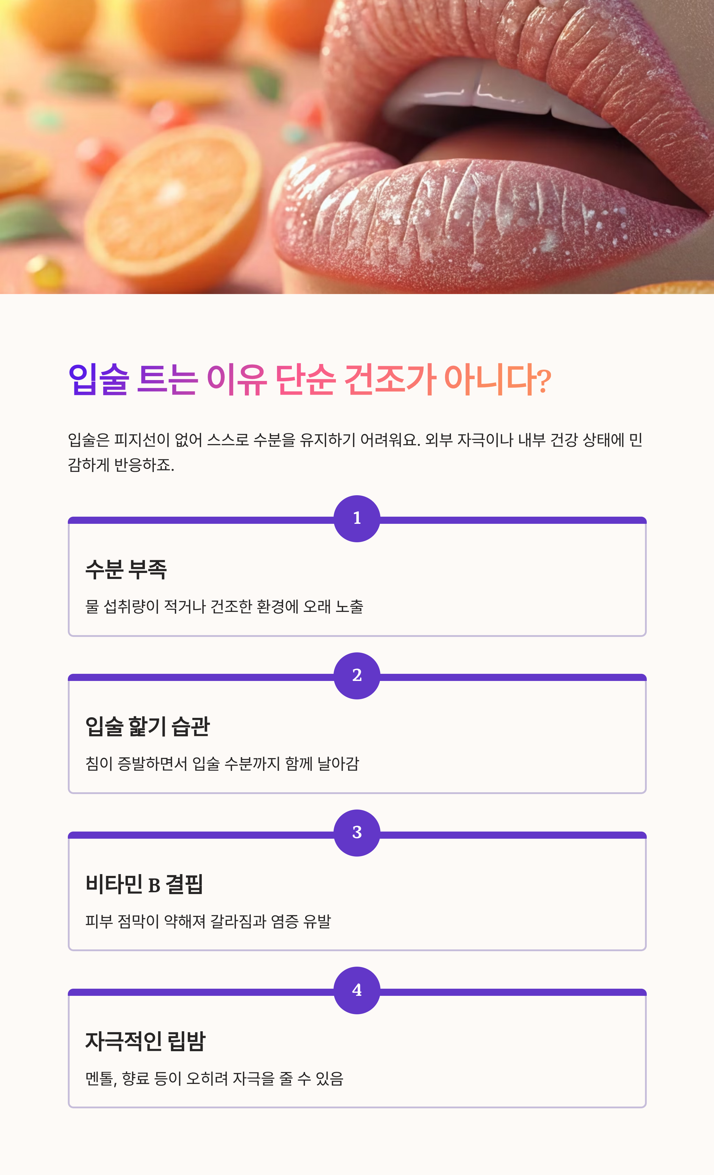 입술이 트는 이유는 단순 건조함 그 이상입니다. 수분, 비타민 B 부족, 잘못된 습관, 자극적인 제품 사용 등 다양한 원인이 복합적으로 작용하죠.