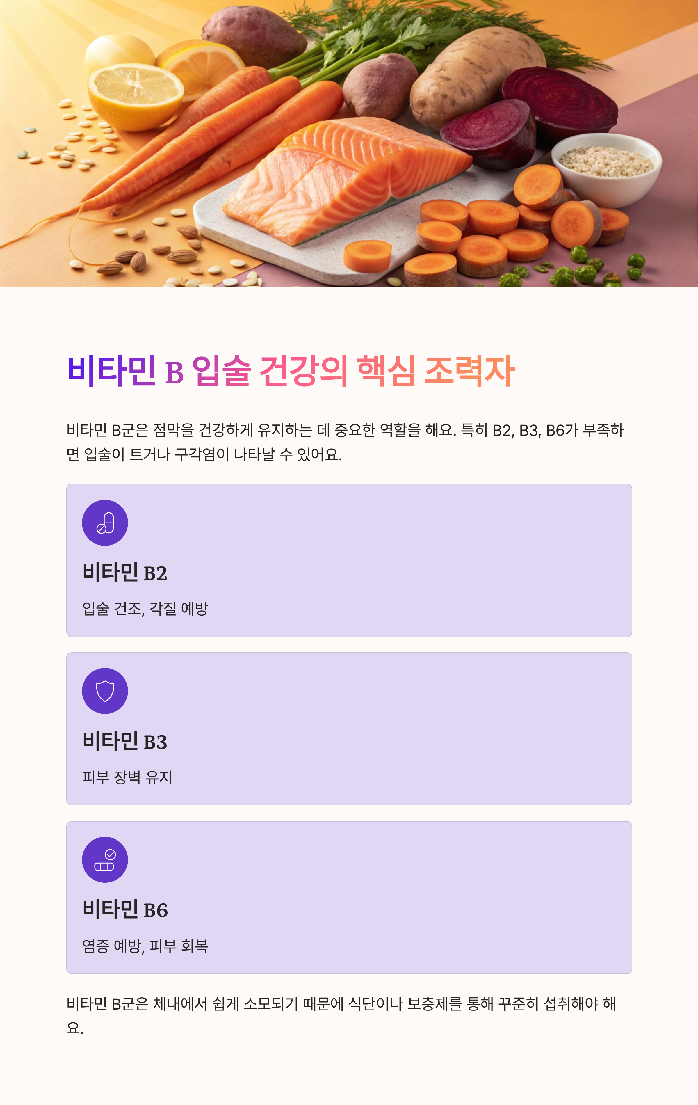 비타민 B군은 점막을 건강하게 유지하는 데 중요한 역할을 해요. 특히 B2, B3, B6가 부족하면 입술이 트거나 입꼬리에 염증이 생기는 구각염이 나타날 수 있어요.