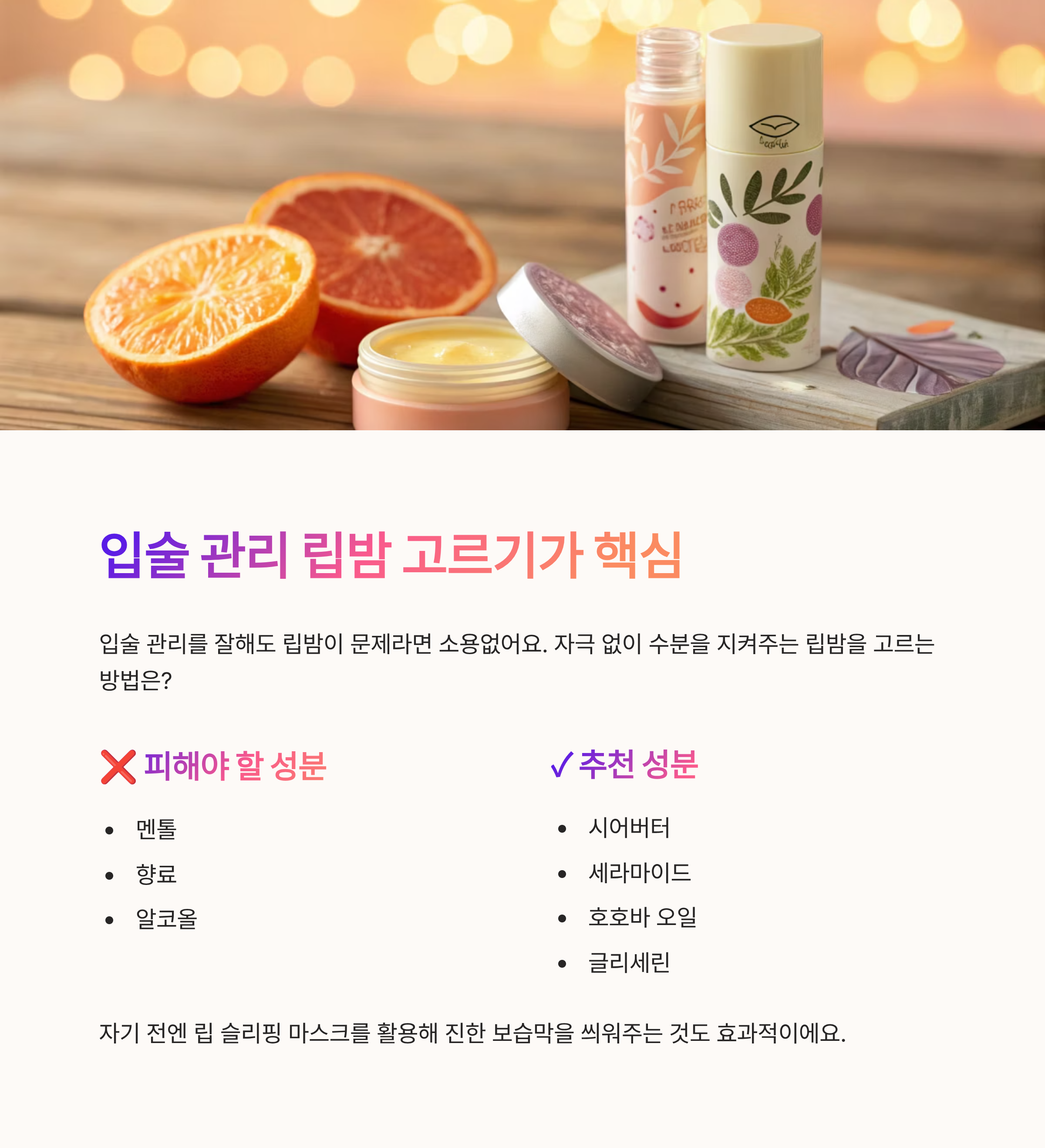 | 자극적인 립밤 | 멘톨, 향료 등이 오히려 자극을 줄 수 있음 |