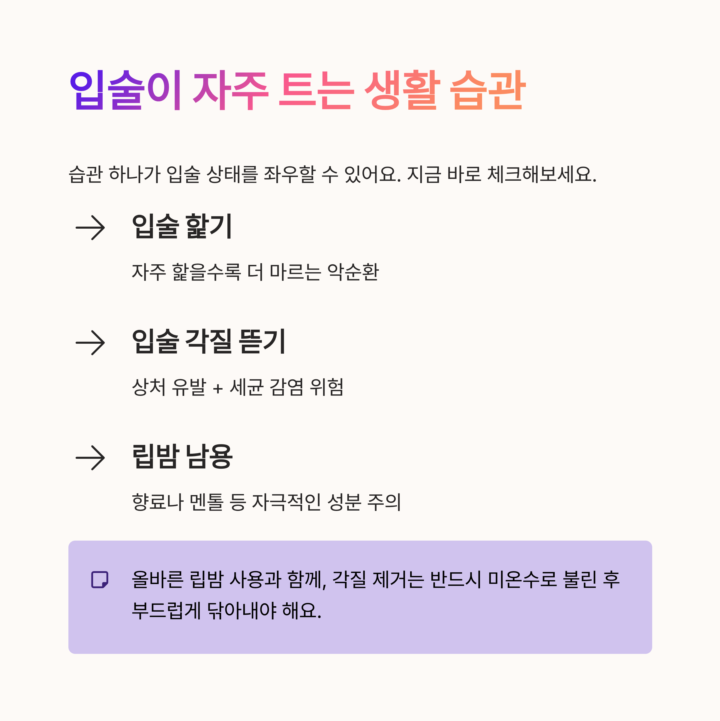 습관 하나가 입술 상태를 좌우할 수 있어요. 지금 바로 자주 하는 행동이 있다면 체크해보세요.