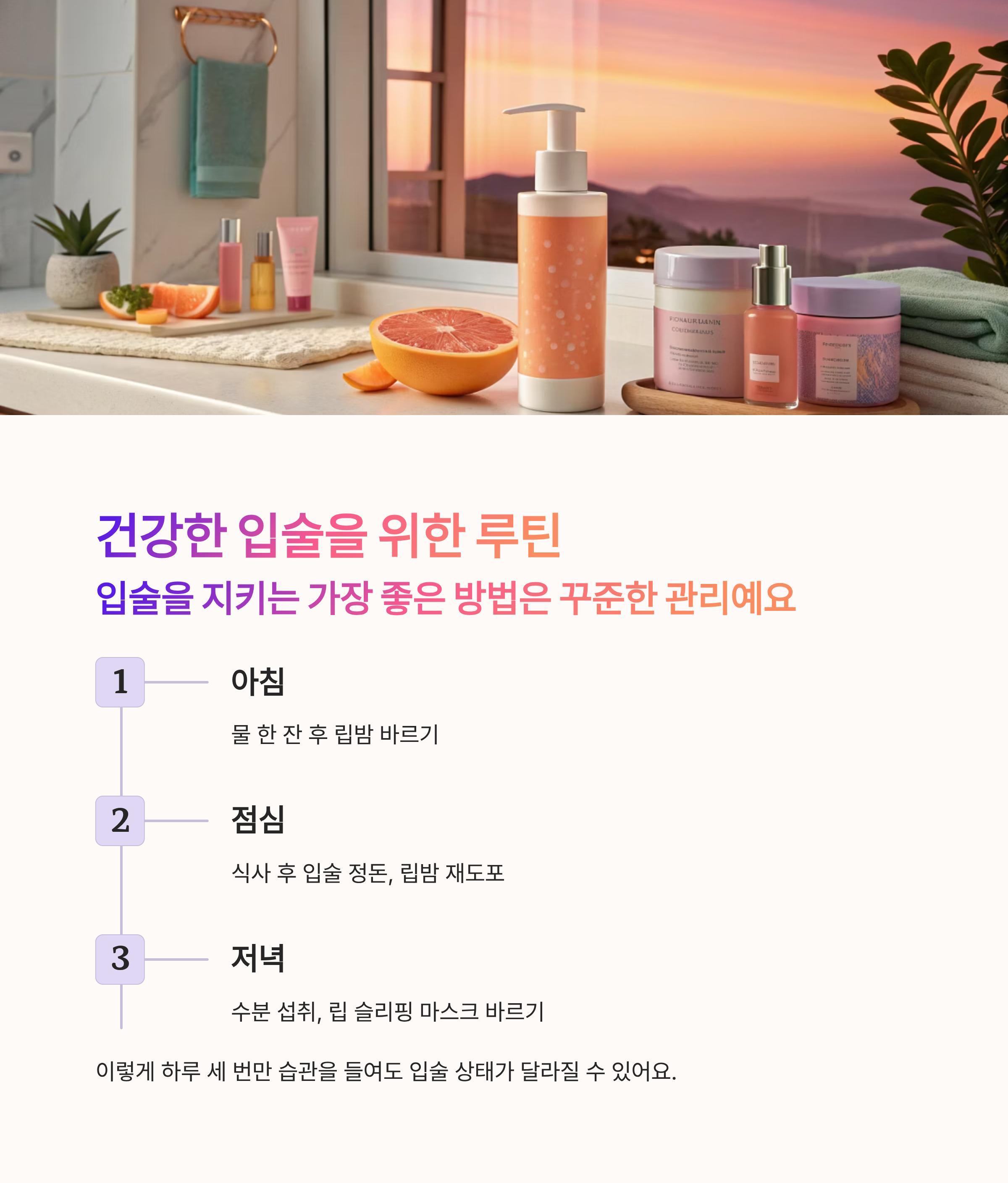 입술을 지키는 가장 좋은 방법은 꾸준한 관리예요. 하루 루틴을 만들어보세요.