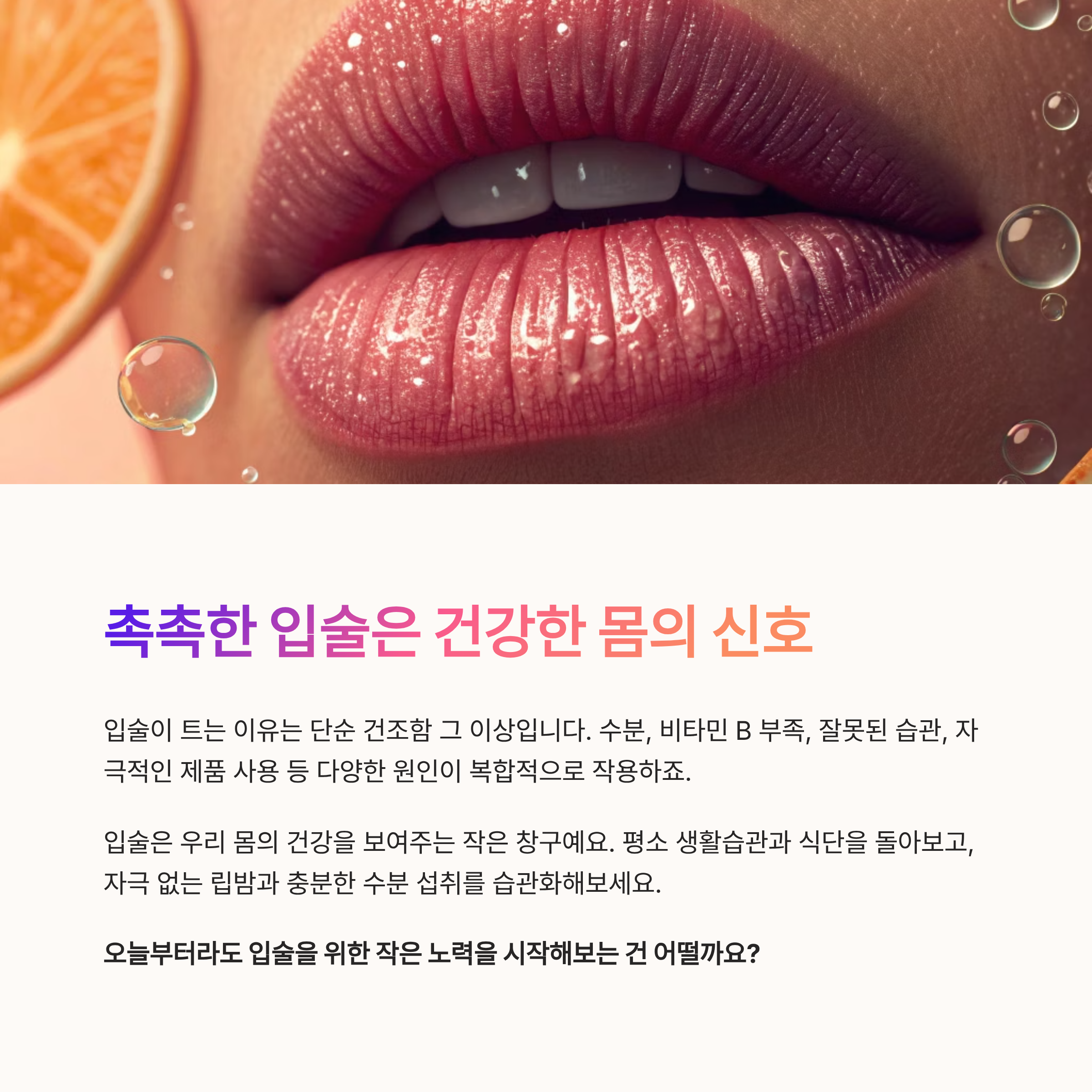 입술은 우리 몸의 건강을 보여주는 작은 창구예요. 평소 생활습관과 식단을 돌아보고, 자극 없는 립밤과 충분한 수분 섭취를 습관화해보세요.
