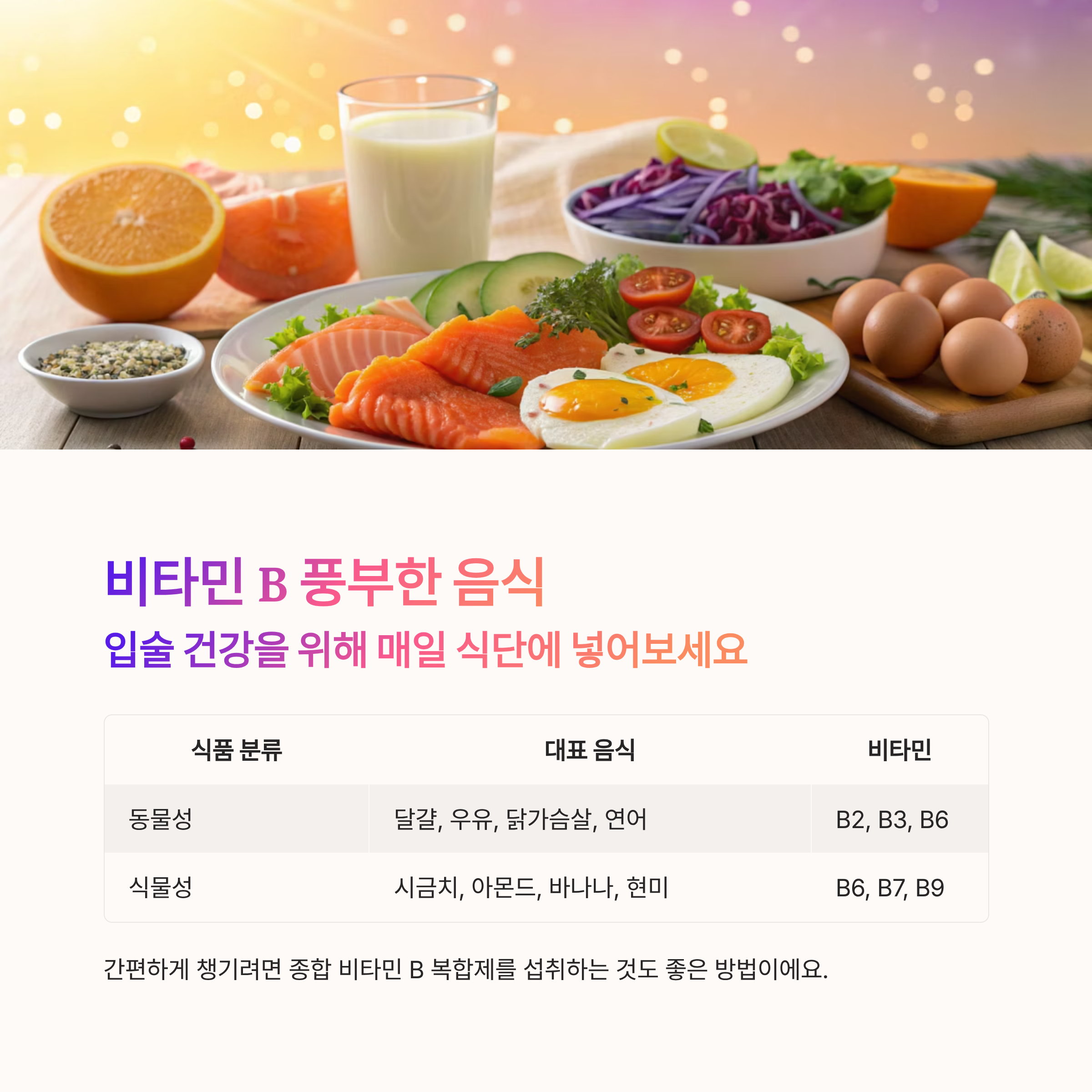 간편하게 챙기려면 종합 비타민 B 복합제를 섭취하는 것도 좋은 방법이에요.