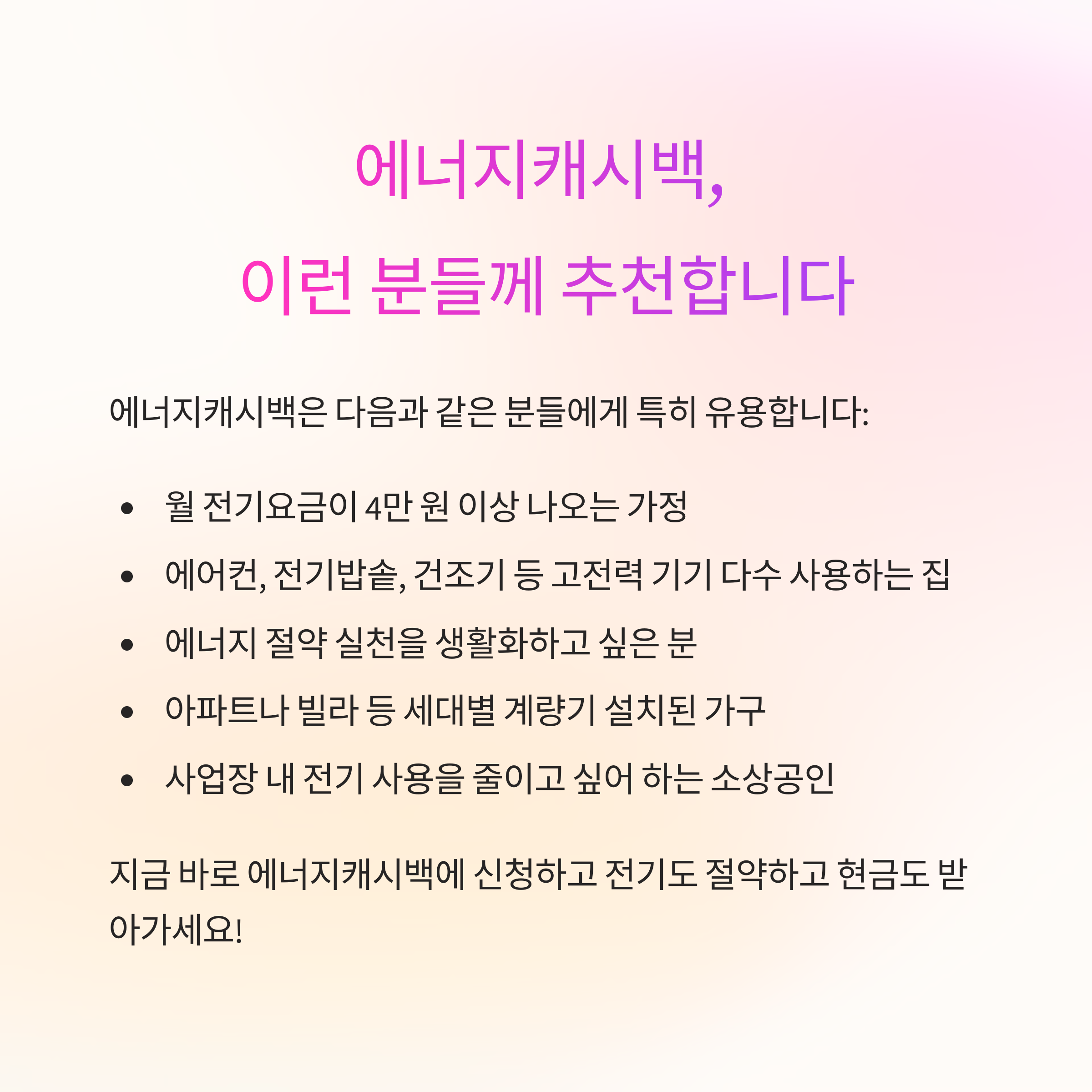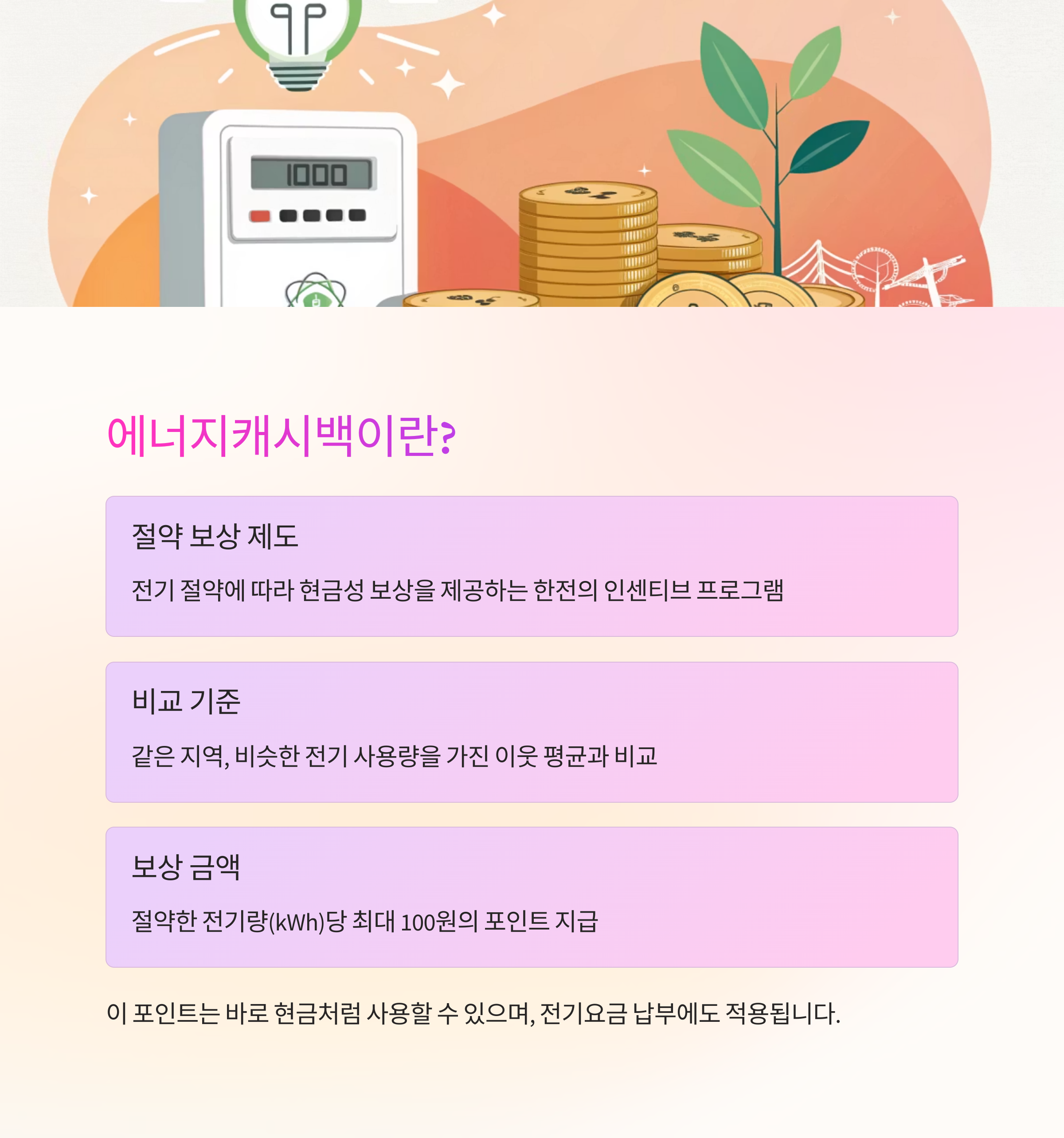 정부와 한국전력이 공동으로 운영하는 에너지캐시백 제도는 가정과 소상공인이 전기 절약만 해도 실제 현금을 돌려받을 수 있는 절약형 인센티브 정책입니다.