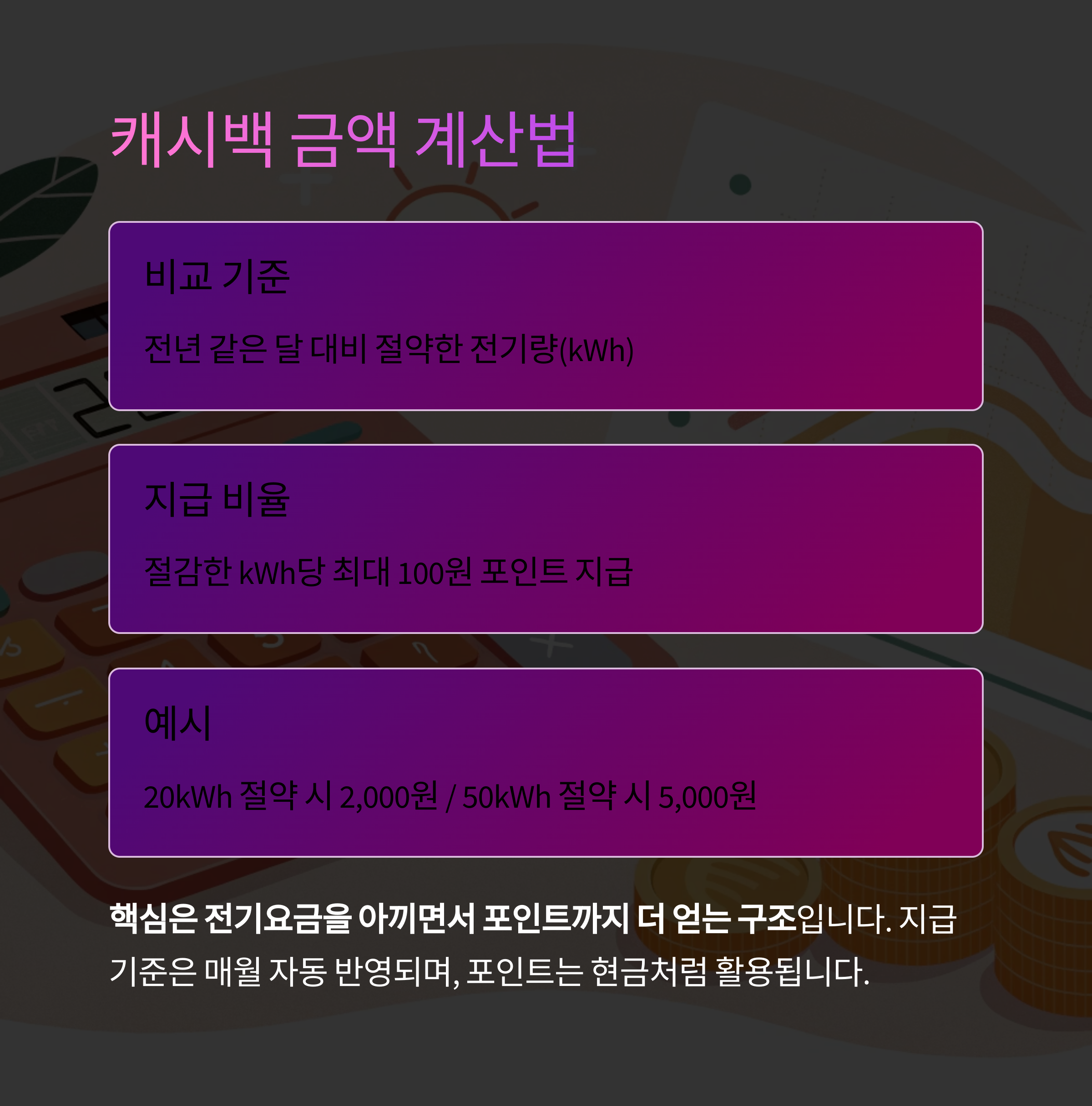 | 20kWh 절약 | 2,000원 (kWh당 100원) | 포인트 또는 요금 차감 |