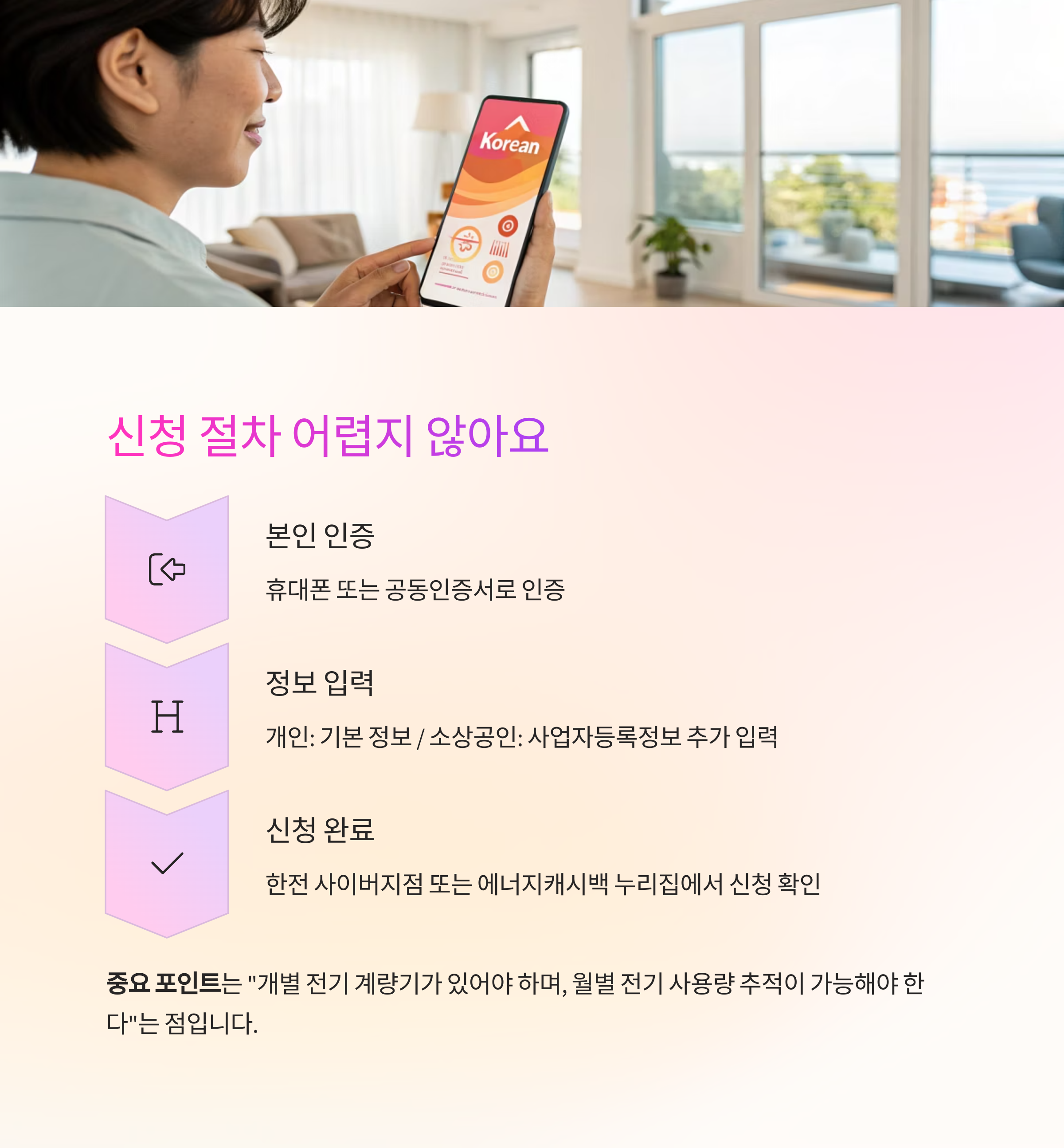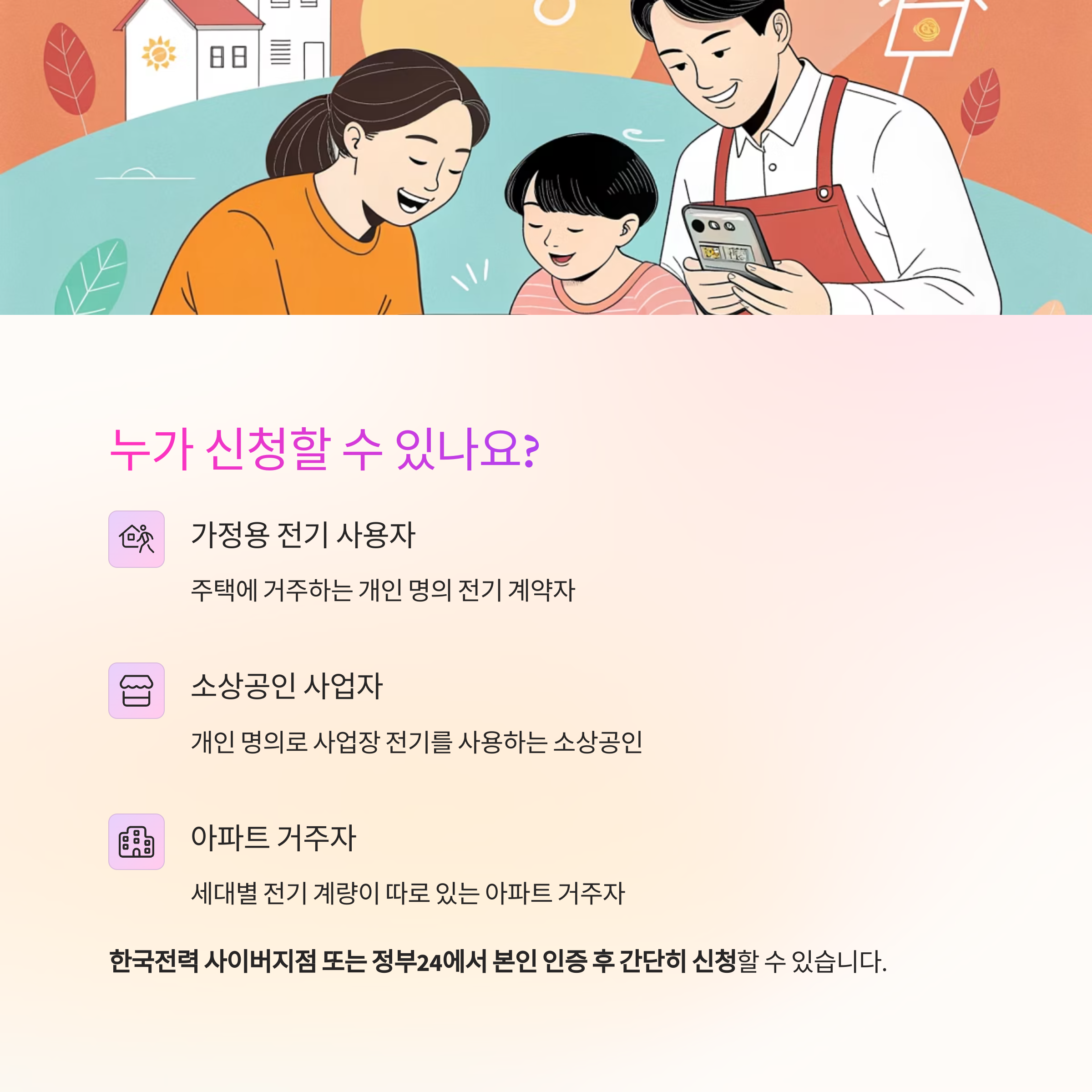 가정용 전기 사용자(주택)와 소상공인 사업자용 전기 사용자라면 누구나 가능합니다.