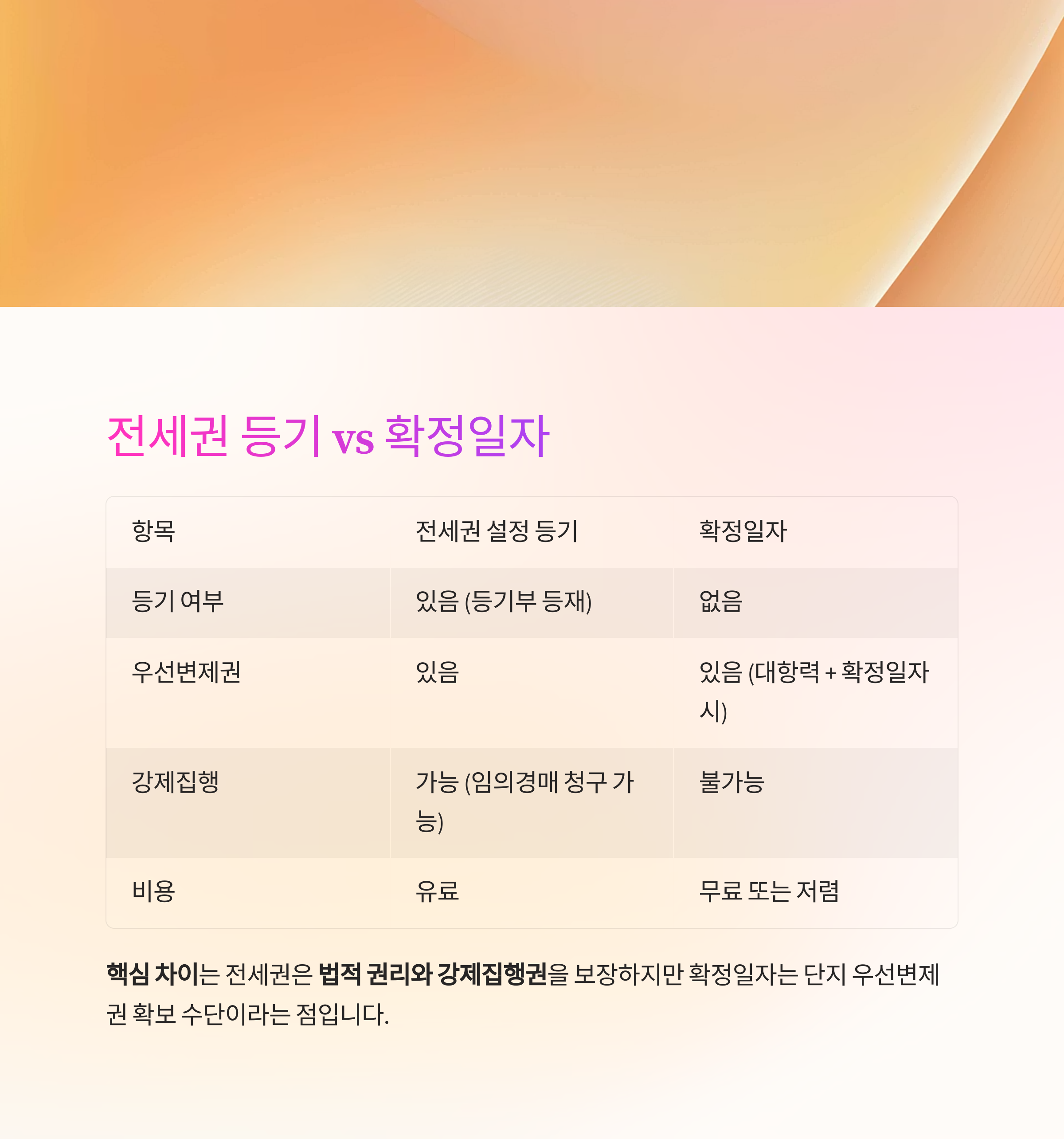 핵심 차이는 전세권은 법적 권리와 강제집행권을 보장하지만
