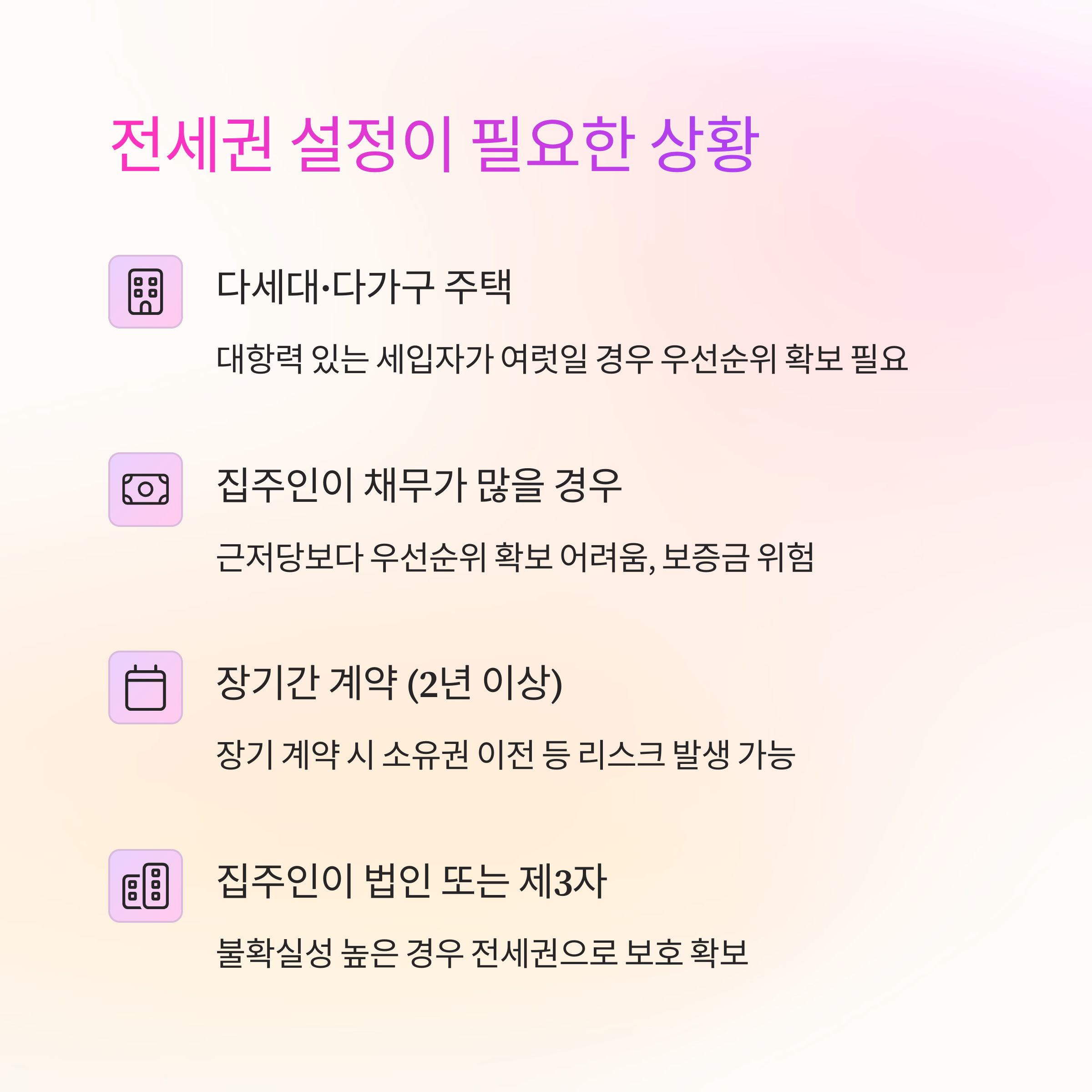 | 집주인이 법인 또는 제3자 | 불확실성 높은 경우 전세권으로 보호 확보 |