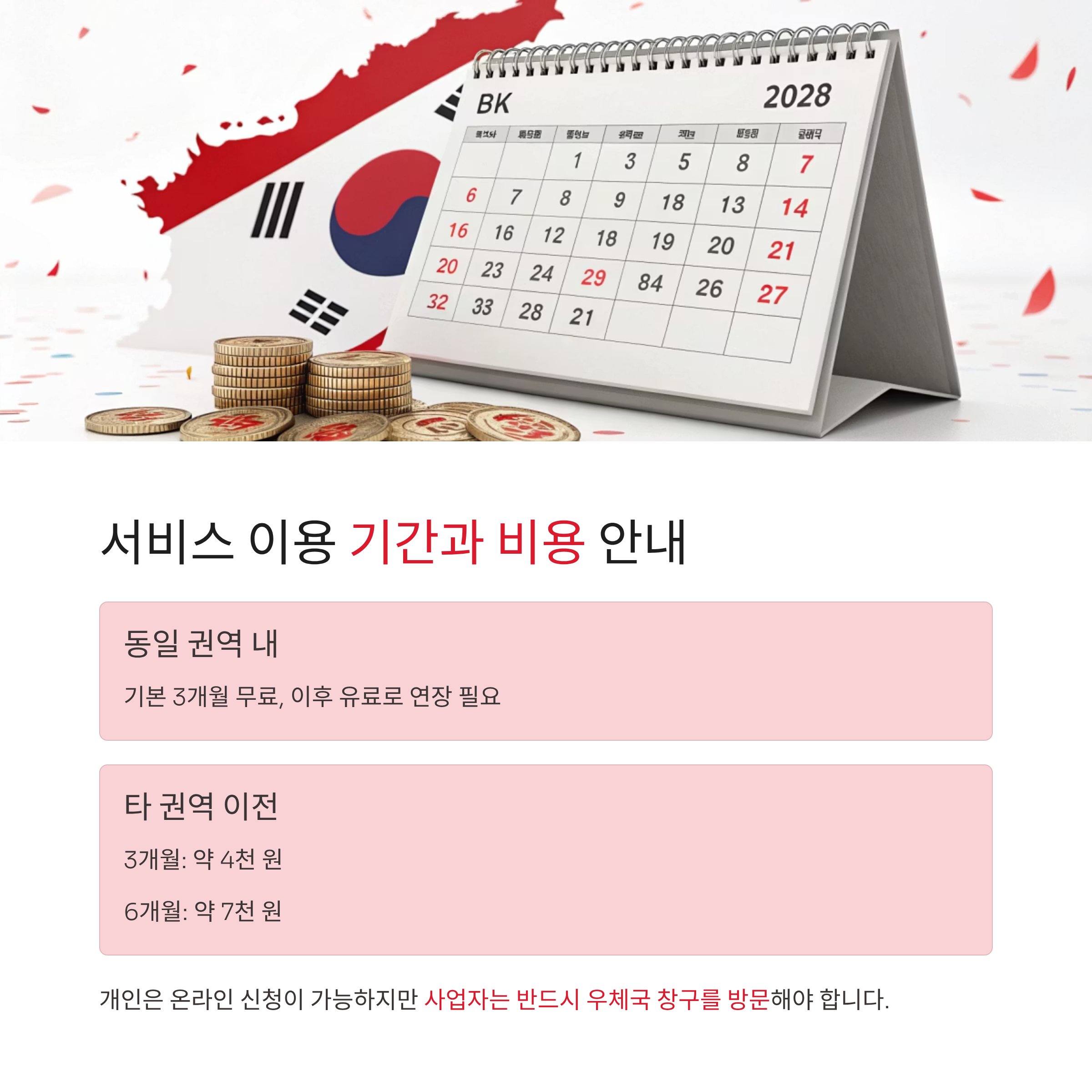 동일 권역 내에서는 기본 3개월 무료, 이후에는 유료로 연장해야 합니다. 타 권역으로 이전할 경우 3개월에 약 4천 원, 6개월에 7천 원 수준의 비용이 부과됩니다. 개인은 온라인 신청이 가능하지만 사업자는 반드시 우체국 창구를 방문해야 합니다.