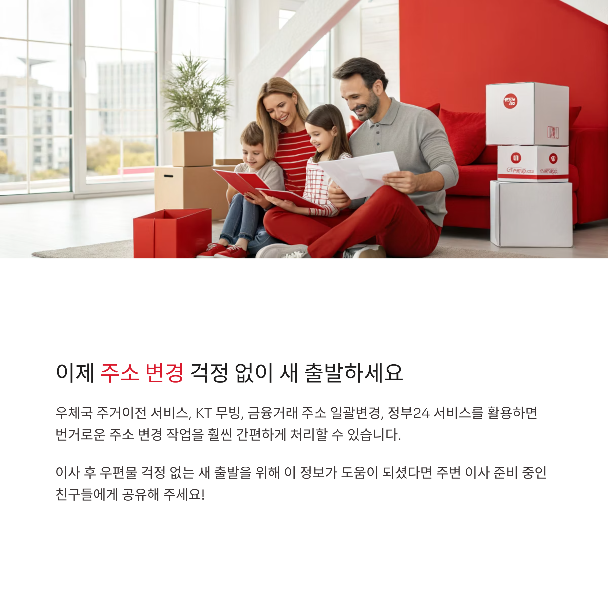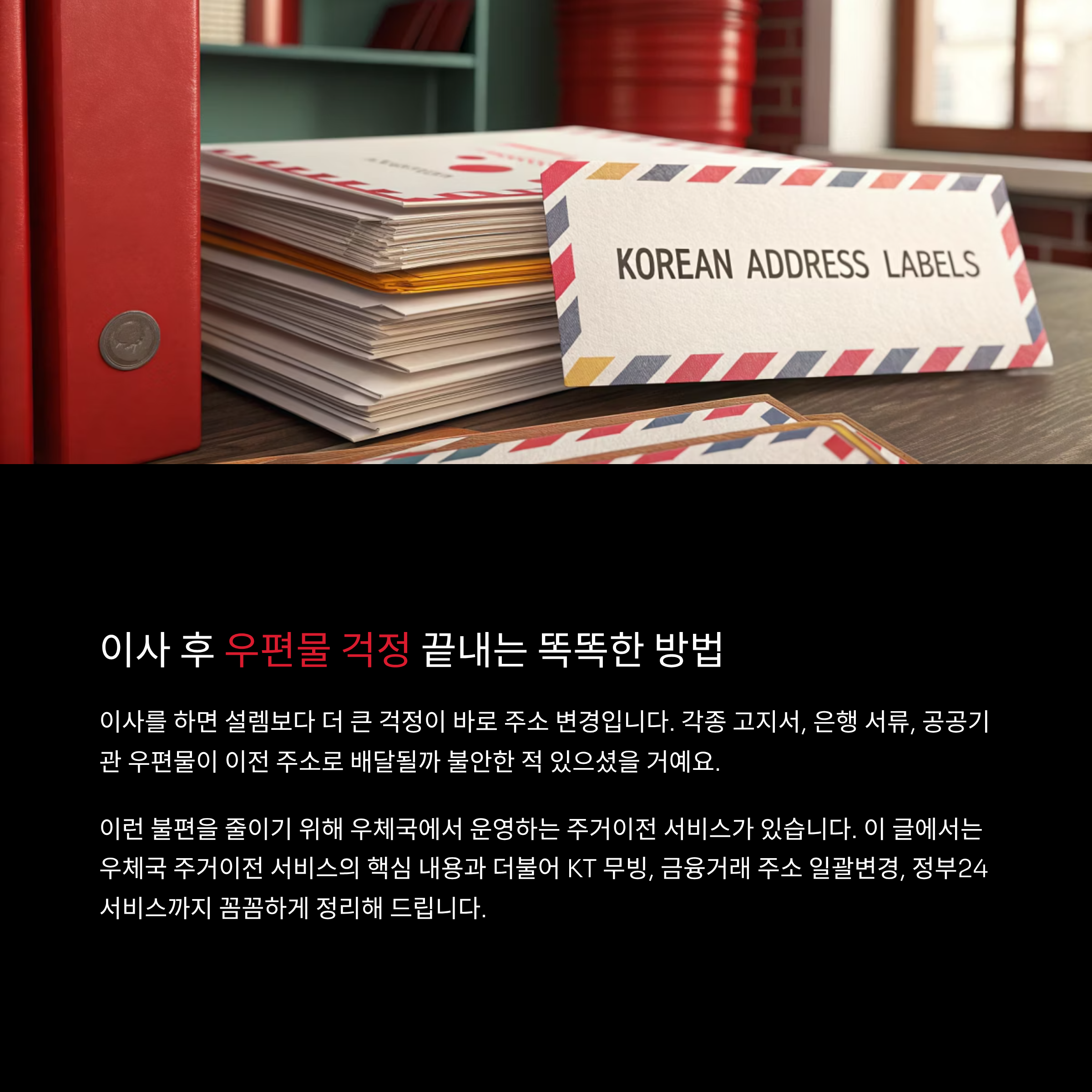 이사를 하면 설렘보다 더 큰 걱정이 바로 주소 변경입니다. 각종 고지서, 은행 서류, 공공기관 우편물이 이전 주소로 배달될까 불안한 적 있으셨을 거예요. 이런 불편을 줄이기 위해 우체국에서 운영하는 주거이전 서비스가 있습니다. 이 글에서는 우체국 주거이전 서비스의 핵심 내용과 더불어 KT 무빙, 금융거래 주소 일괄변경, 정부24 서비스까지 꼼꼼하게 정리해 드립니다. 이제 이사 후 주소 변경, 어렵지 않게 끝낼 수 있습니다.