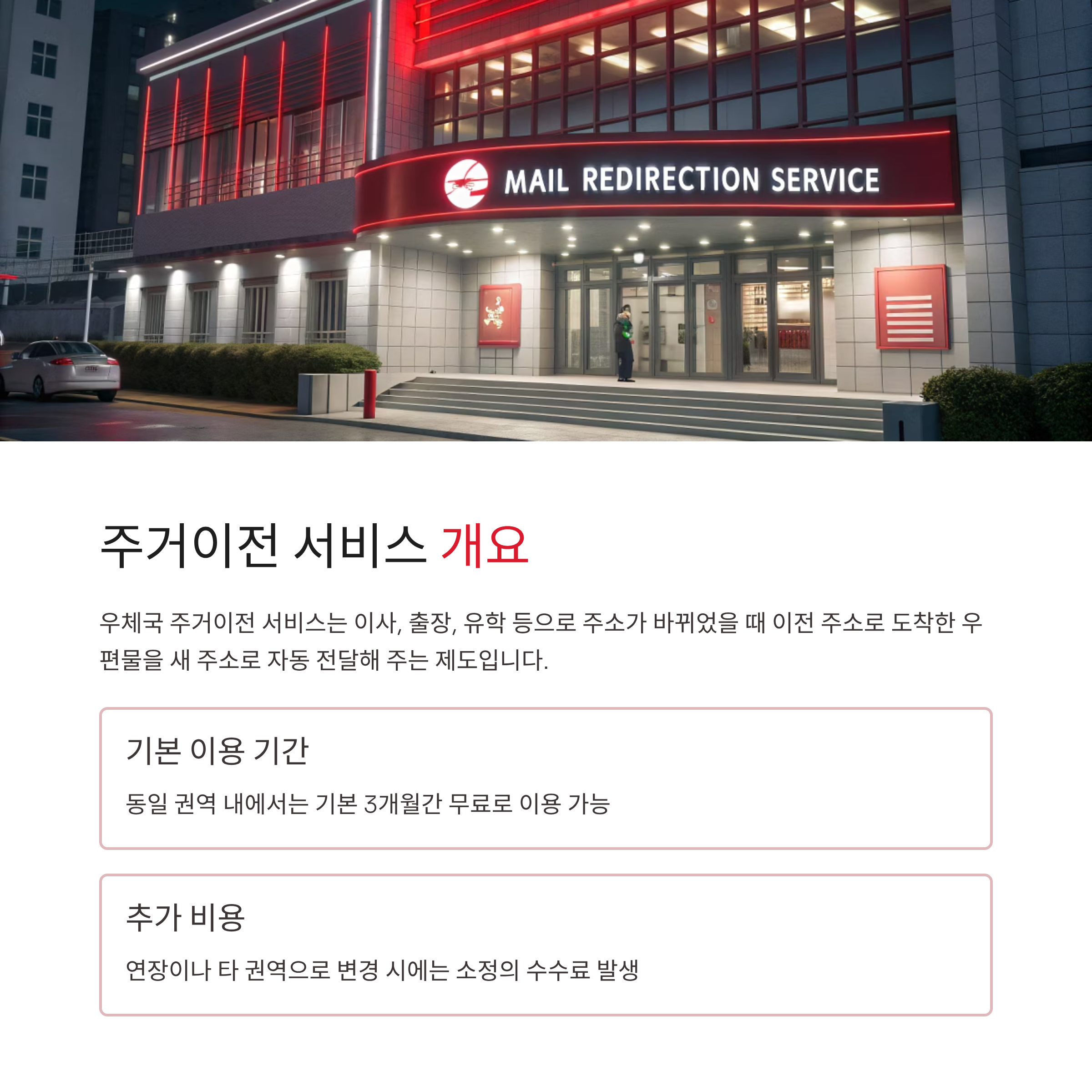 우체국 주거이전 서비스는 이사, 출장, 유학 등으로 주소가 바뀌었을 때 이전 주소로 도착한 우편물을 새 주소로 자동 전달해 주는 제도입니다. 기본 3개월간 동일 권역 내에서는 무료로 이용할 수 있으며, 연장이나 타 권역으로 변경 시에는 소정의 수수료가 발생합니다.