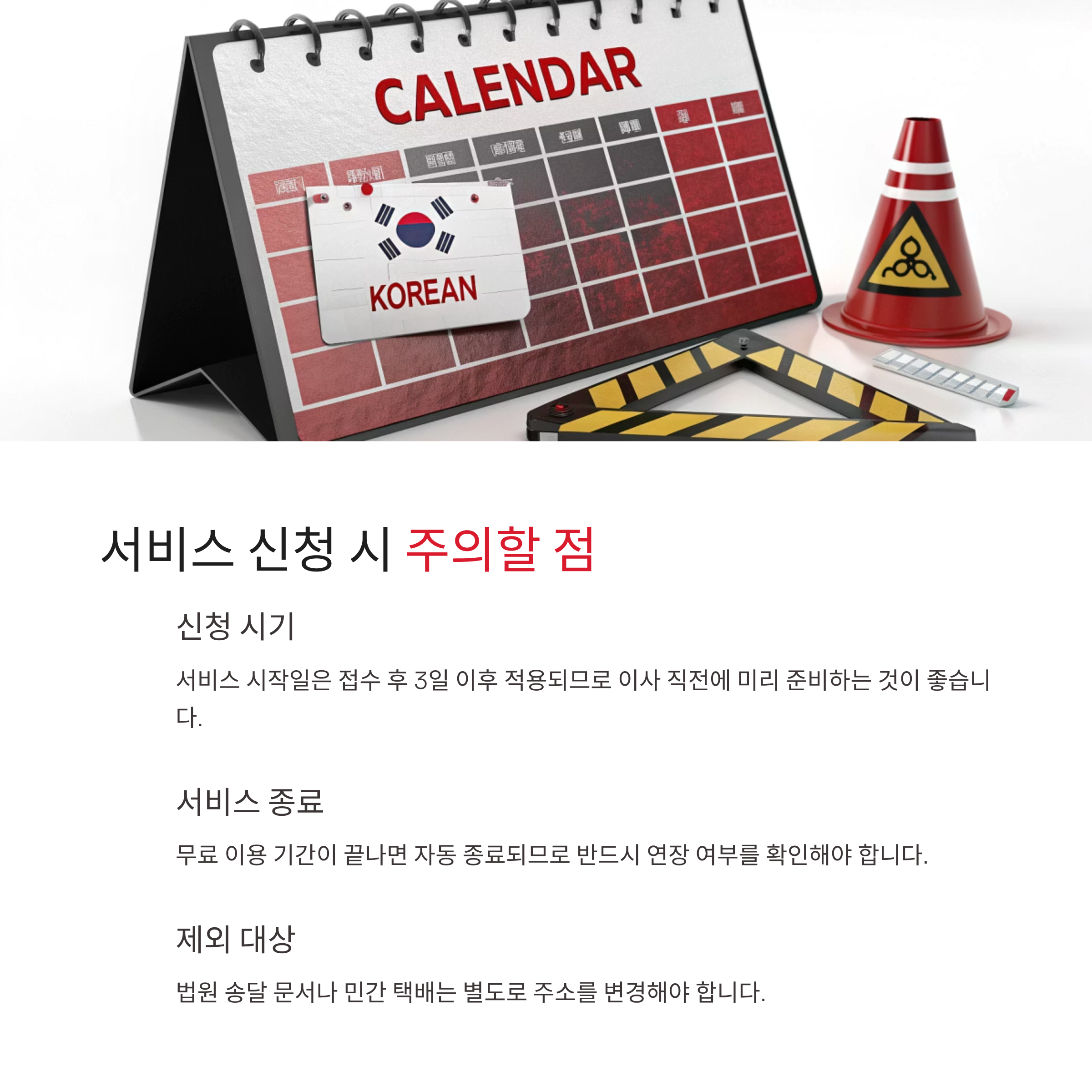 서비스 시작일은 접수 후 3일 이후 적용되므로 이사 직전에 미리 준비하는 것이 좋습니다. 무료 이용 기간이 끝나면 자동 종료되므로 반드시 연장 여부를 확인해야 하며, 법원 송달 문서나 민간 택배는 별도로 주소를 변경해야 합니다.