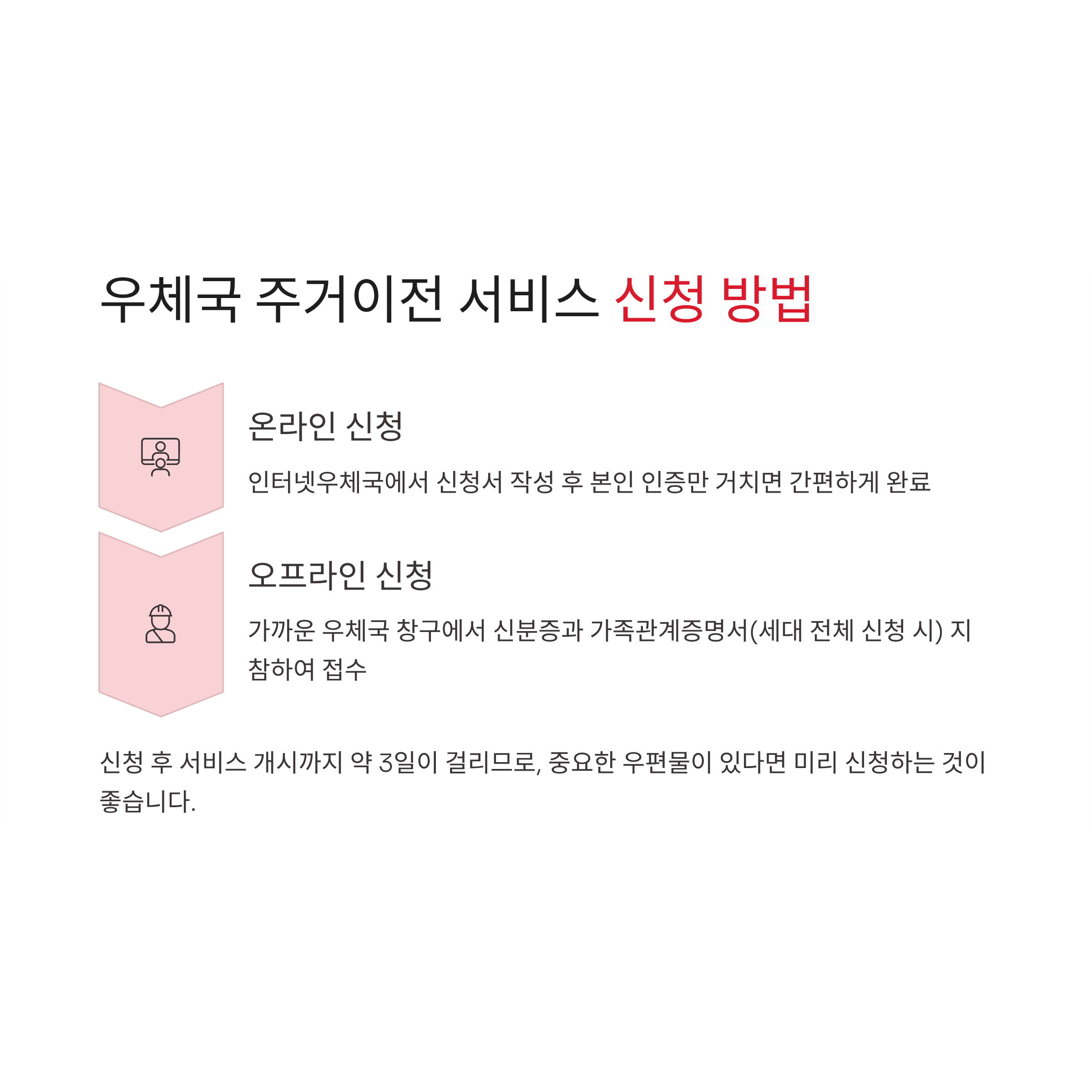 인터넷우체국에서 신청서를 작성하거나 가까운 우체국 창구에서 직접 접수할 수 있습니다. 신청 후 서비스 개시까지 약 3일이 걸리므로, 중요한 우편물이 있다면 미리 신청하는 것이 좋습니다. 온라인 신청은 본인 인증만 거치면 간편하게 완료할 수 있고, 오프라인 신청 시 신분증과 가족관계증명서(세대 전체 신청 시)가 필요합니다.