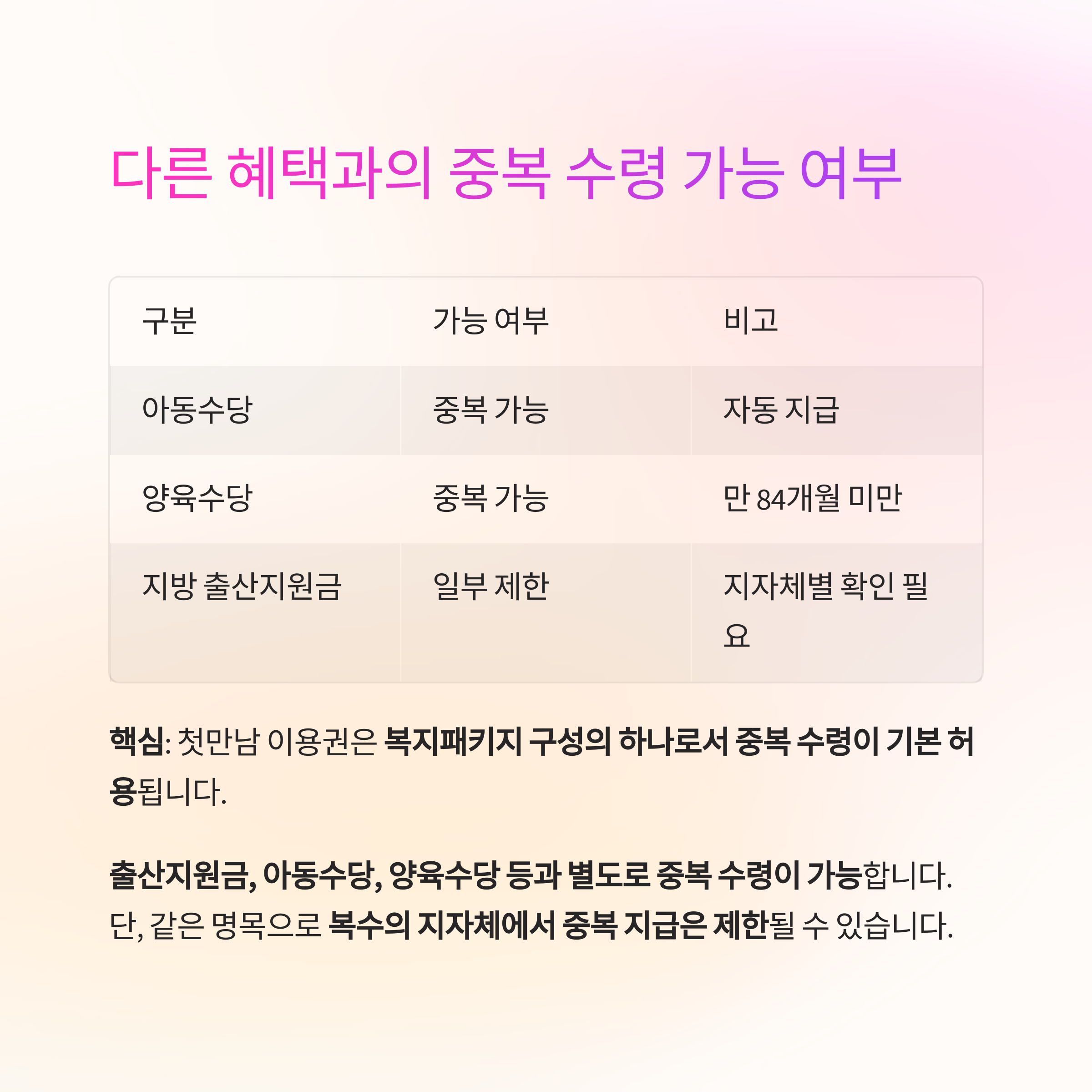 핵심: 첫만남 이용권은 복지패키지 구성의 하나로서 중복 수령이 기본 허용됩니다