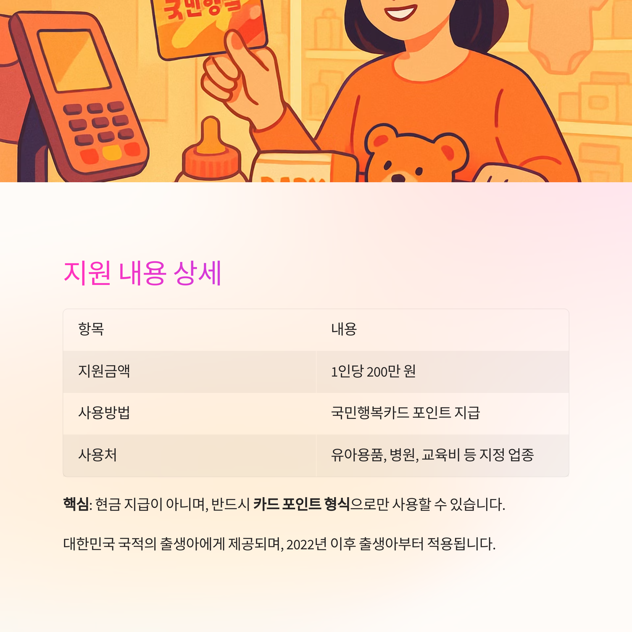 출생 시점에 관계없이 2022년 이후 출생아부터 적용되며, 지정된 곳에서만 사용 가능합니다