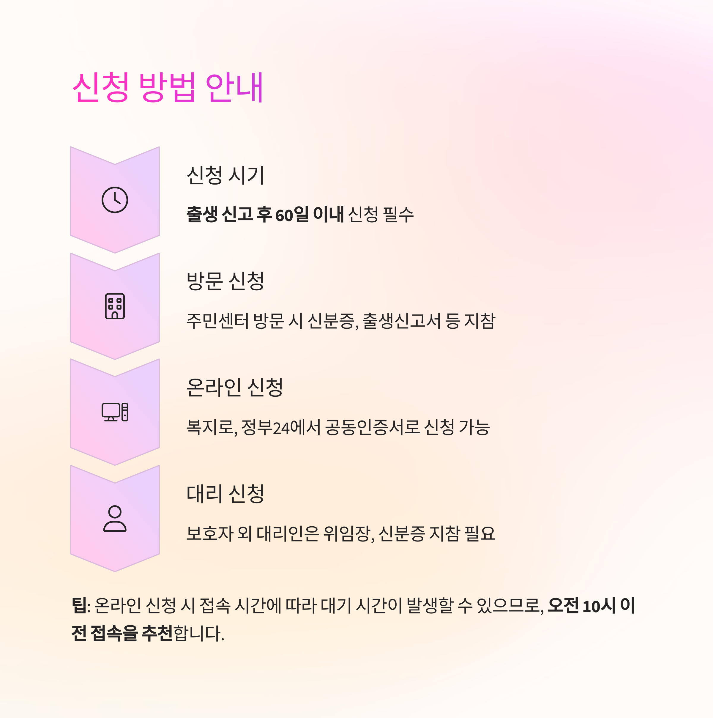 | 방문 신청 | 주민센터 | 신분증, 출생신고서 등 |