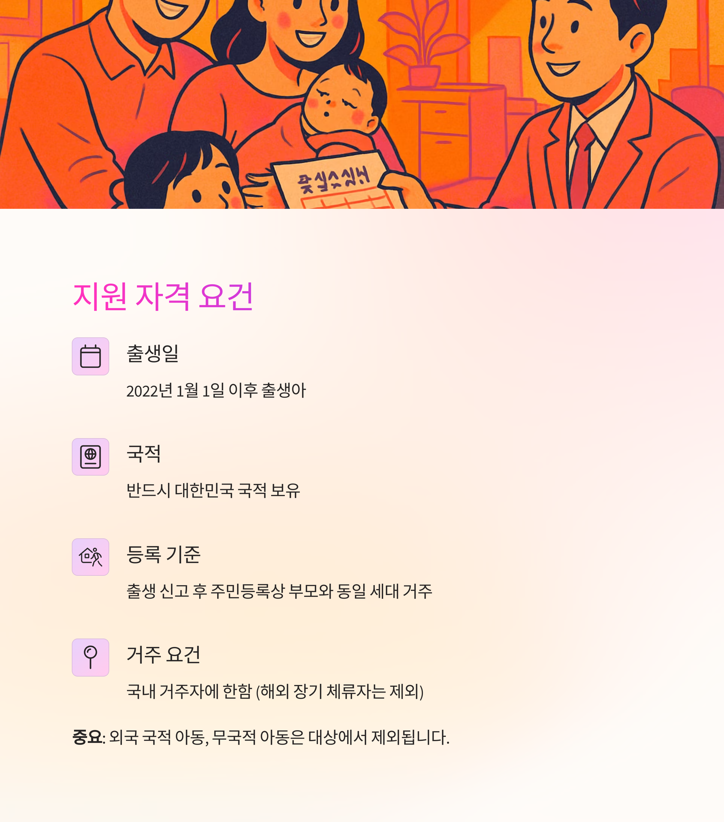 지원 자격은 출생일과 부모의 주민등록 요건을 기준으로 결정됩니다