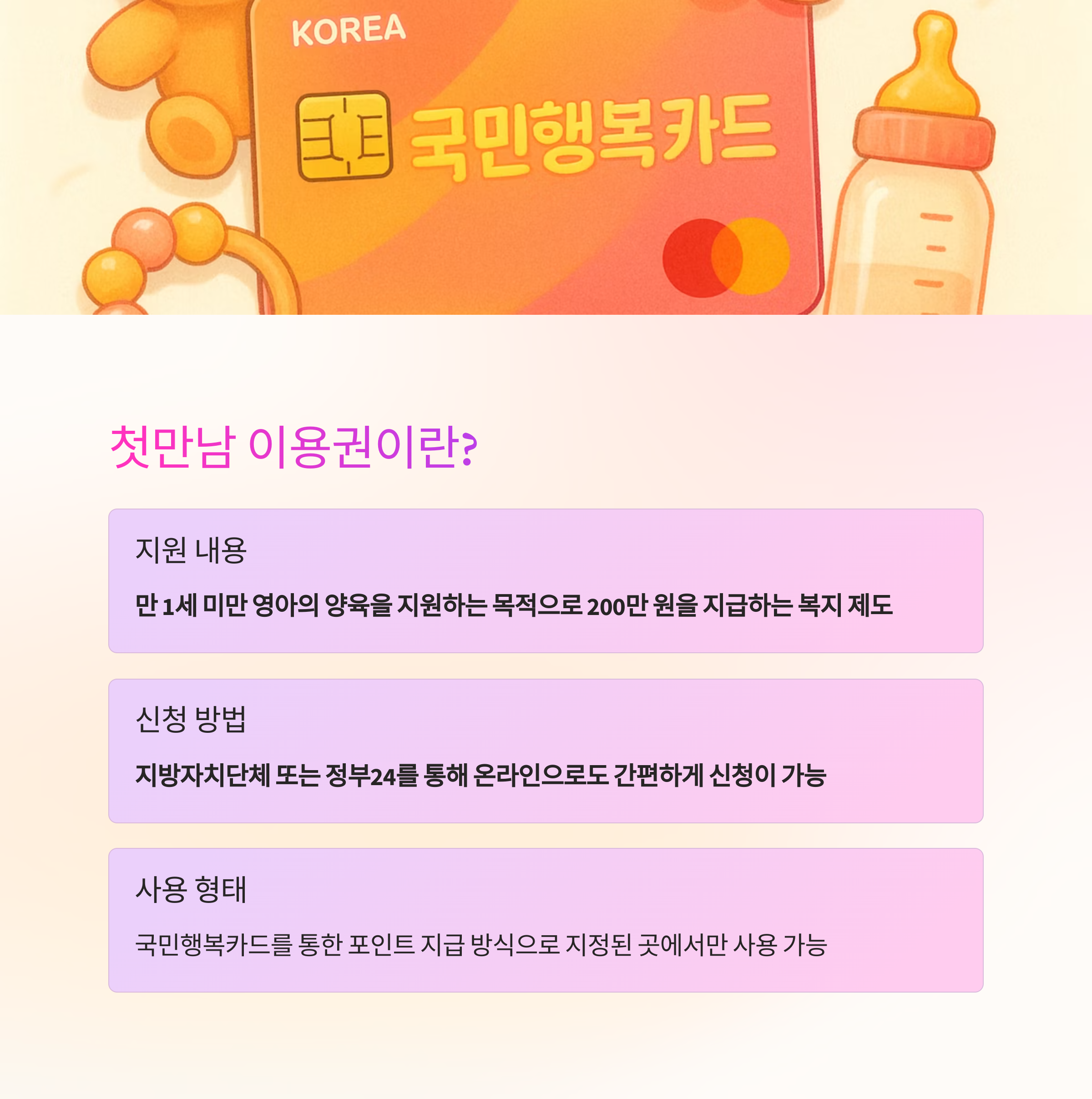 첫만남 이용권은 대한민국 국적의 출생아에게 200만 원 상당의 국민행복카드를 제공하는 지원 정책입니다