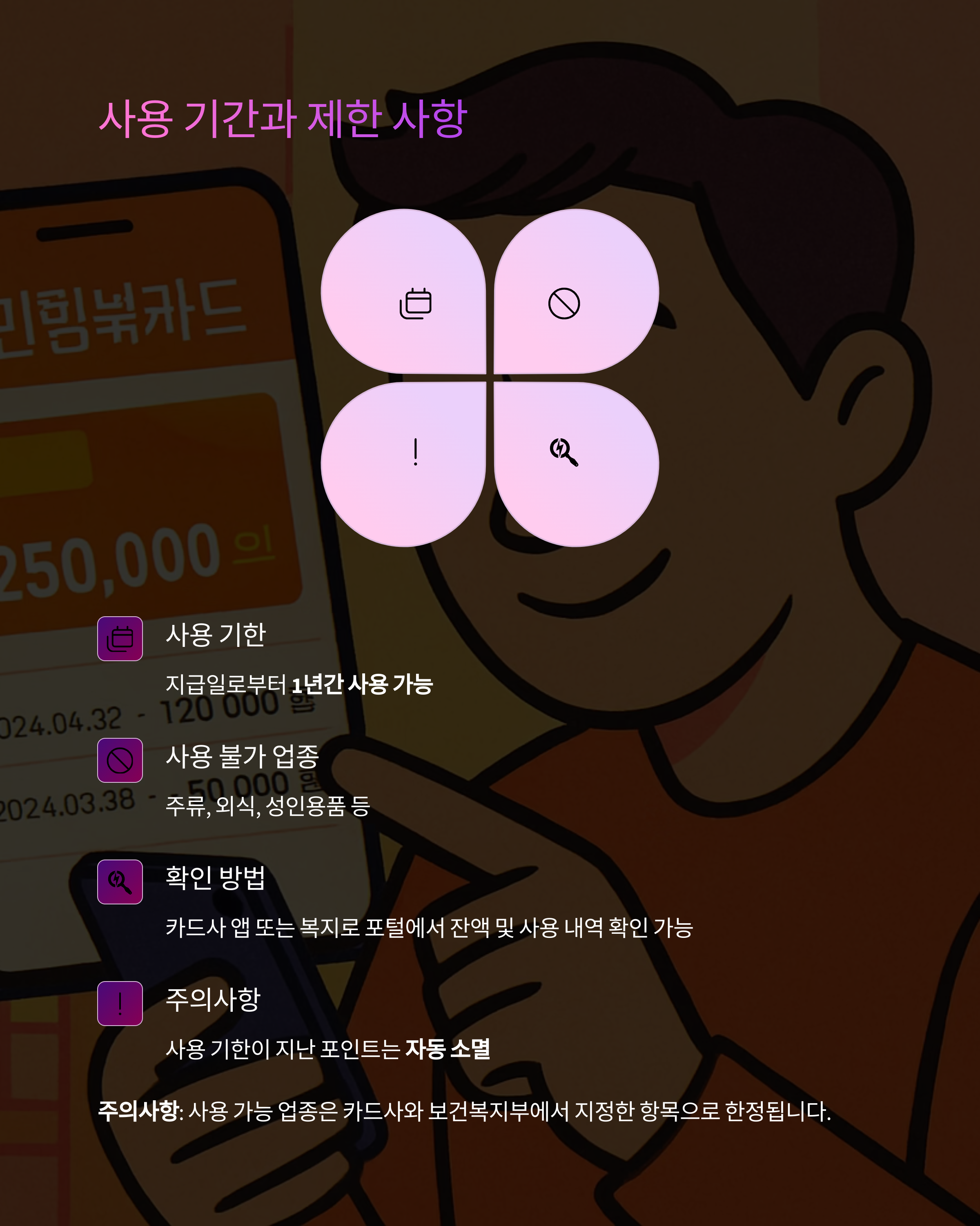 주의사항: 사용 가능 업종은 카드사와 보건복지부에서 지정한 항목으로 한정됩니다