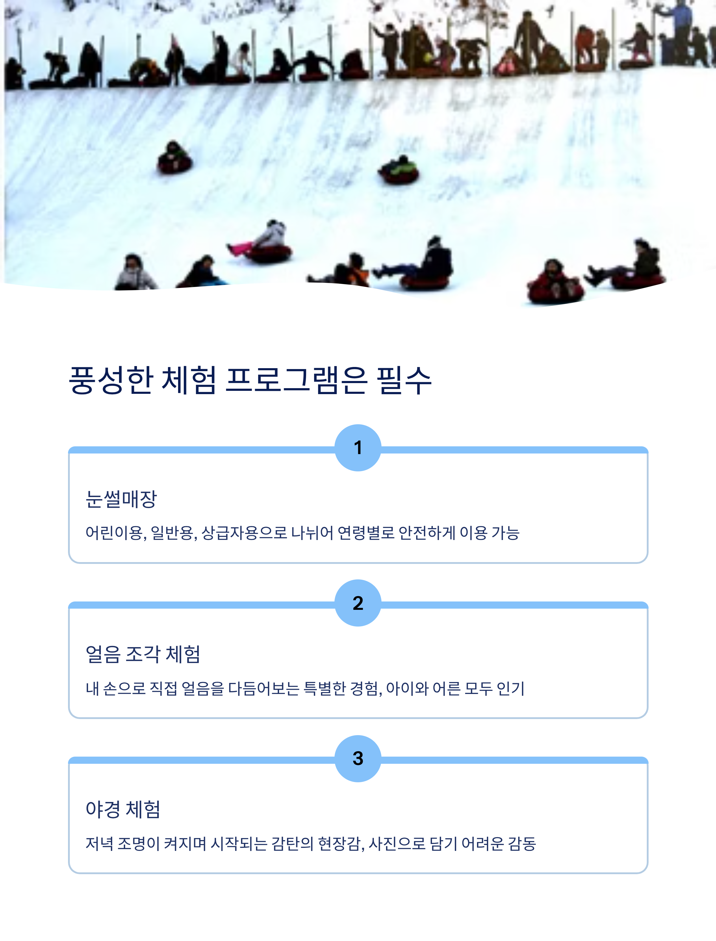 가장 좋았던 포토존이나 추천 간식, 꼭 타야 할 눈썰매 코스 등 댓글로 공유해주세요!