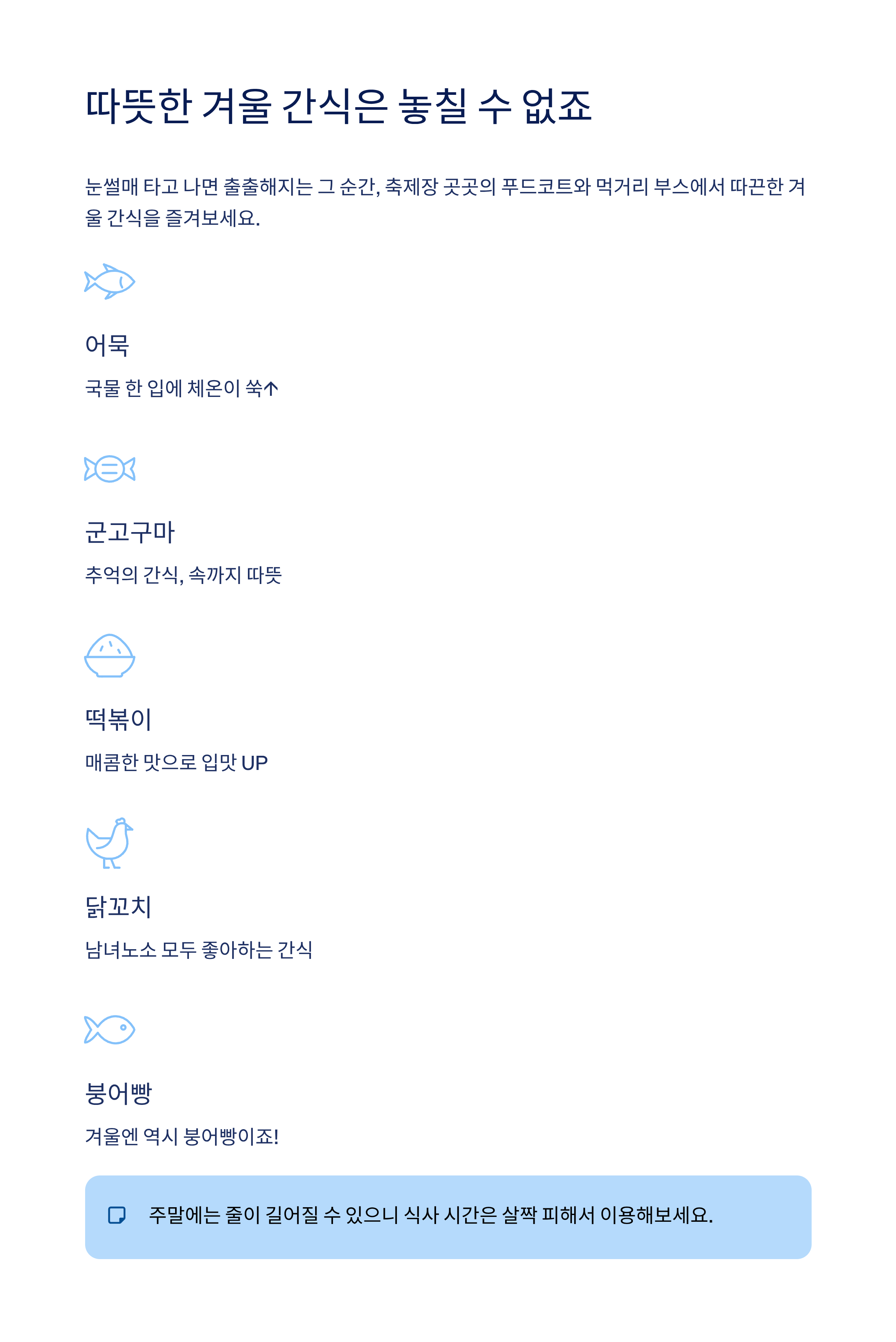 축제장 곳곳에 마련된 푸드코트와 간이 먹거리 부스에서 따끈한 겨울 간식을 즐겨보세요.