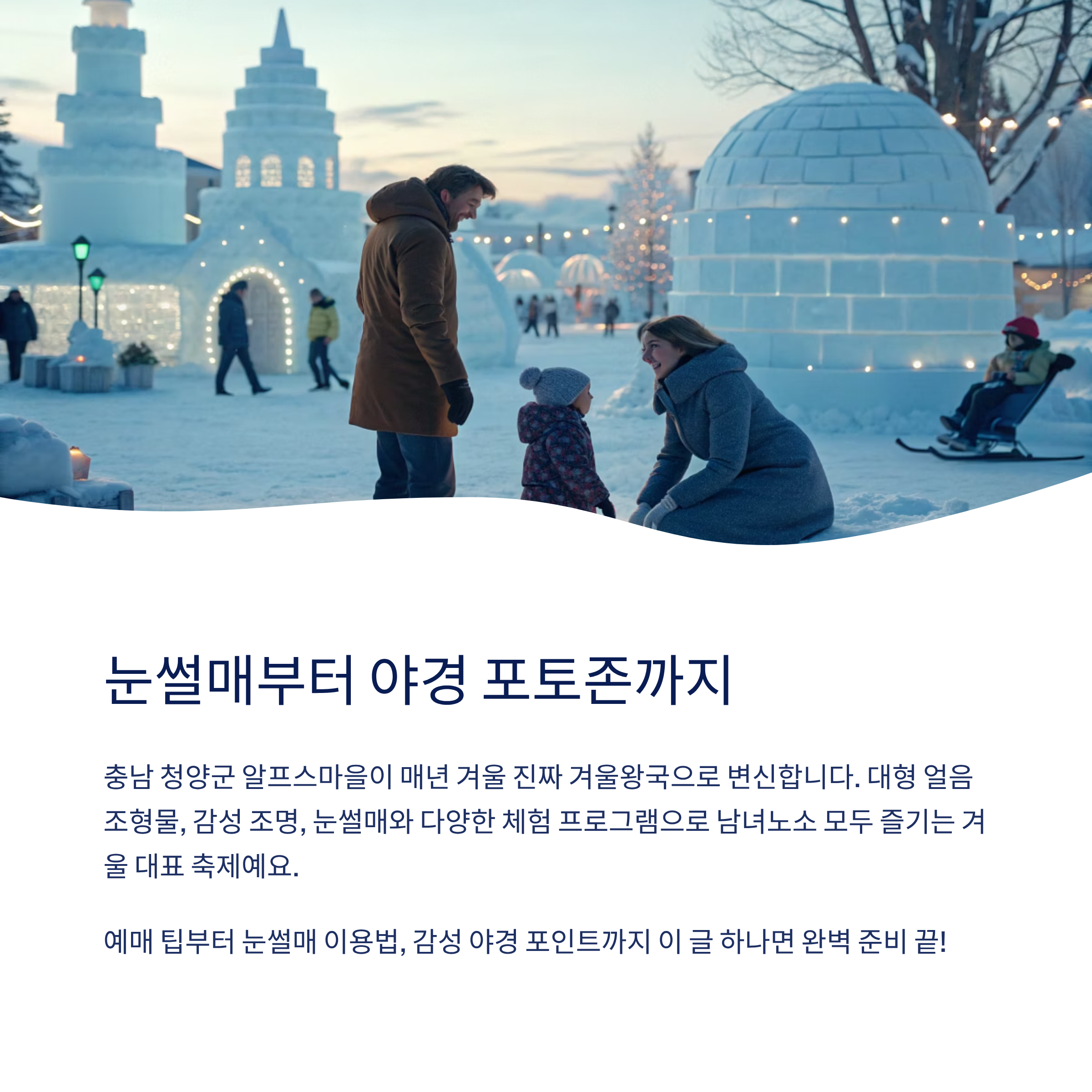 2026년 청양 얼음축제는 대형 얼음 조형물과 감성 조명, 가족이 함께 즐길 눈썰매와 다양한 체험 프로그램으로